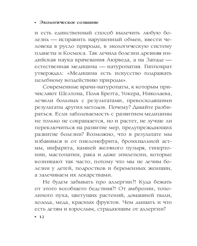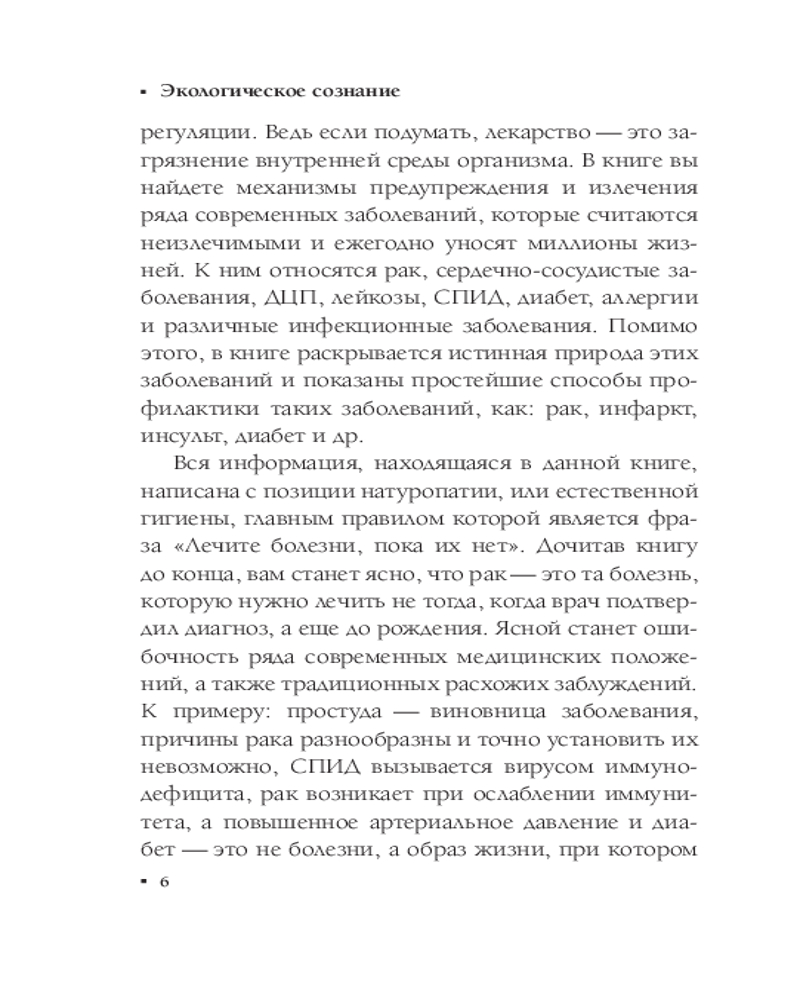 Такие болезни, как ВИЧ, диабет, рак, можно предупредить, и благодаря книге «Экологическое сознание. Естественное оздоровление» вы узнаете, как это сделать. Вы научитесь отличать вредную пищу, отравляющую человека, от целительной, способной очистить и излечить ваш организм. Верните здоровье себе и своим близким с помощью методик натуропатии.