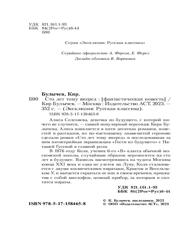 💳 Оплатить за товар можно при получении 🇰🇿 Есть бесплатная доставка по Казахстану от 1 дня 🎁 Копите бонусы с каждой покупки Серия: Эксклюзив: Русская классика Алиса Селезнева, девочка из будущего, с которой ничего не случится, — самый популярный персонаж Кира Булычева. Алиса появляется в пяти десятках романов, повестей и рассказов, но по-настоящему знаменитой героиню сделали роман «Сто лет тому вперед» и последовавшая за ним пятисерийная экранизация «Гостья из будущего» с Наташей Гусевой в главной роли. |