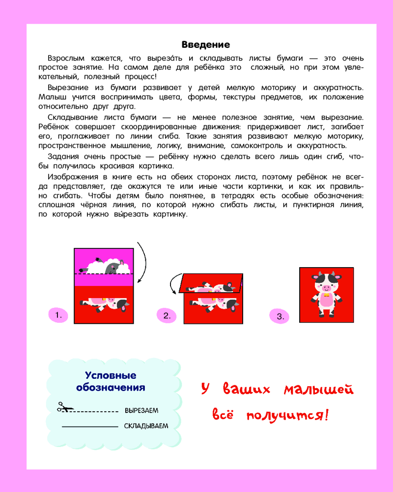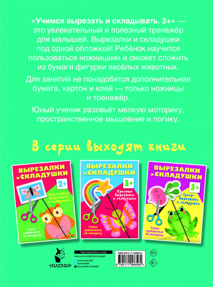 Учимся вырезать и складыватьВалентина Геннадьевна Дмитриева В данный момент этот товар отсутствует в продаже. Возможно, у нас найдется аналогичный или похожий товар здесь. Серия: Вырезалки и складушки «Учимся вырезать и складывать. 2+» — это увлекательный и полезный тренажёр для малышей. Вырезалки и складушки под одной обложкой! Ребёнок научится пользоваться ножницами и сможет сложить из бумаги весёлых животных. Для занятий не понадобится дополнительная бумага, картон и клей — только ножницы и тренажёр! С помощью тренажёра юный ученик разовьёт мелкую моторику, пространственное мышление и логику. |