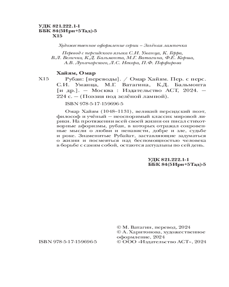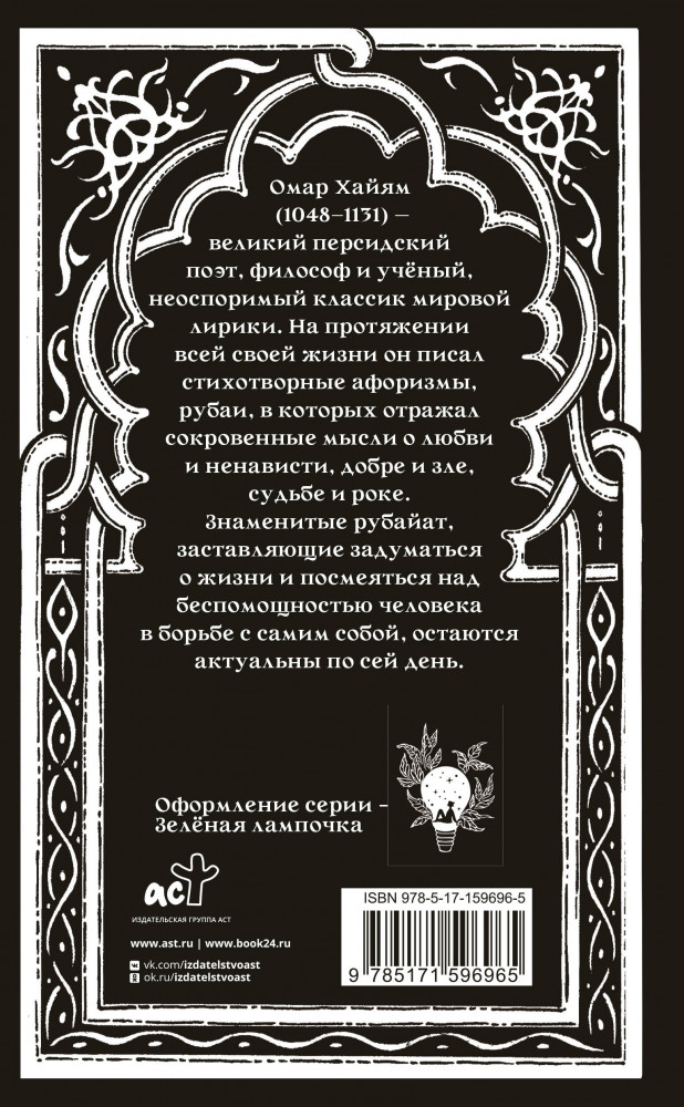 💳 Оплатить за товар можно при получении 🇰🇿 Есть бесплатная доставка по Казахстану от 1 дня 🎁 Копите бонусы с каждой покупки Серия: Поэзия под зелёной лампой Омар Хайям (1048-1131) — великий персидский поэт, философ и учёный, неоспоримый классик мировой лирики. На протяжении всей своей жизни он писал стихотворные афоризмы, рубаи, в которых отражал сокровенные мысли о любви и ненависти, добре и зле, судьбе и роке. Знаменитые рубайат, заставляющие задуматься о жизни и посмеяться над беспомощностью человека в борьбе с самим собой, остаются актуальны по сей день. |