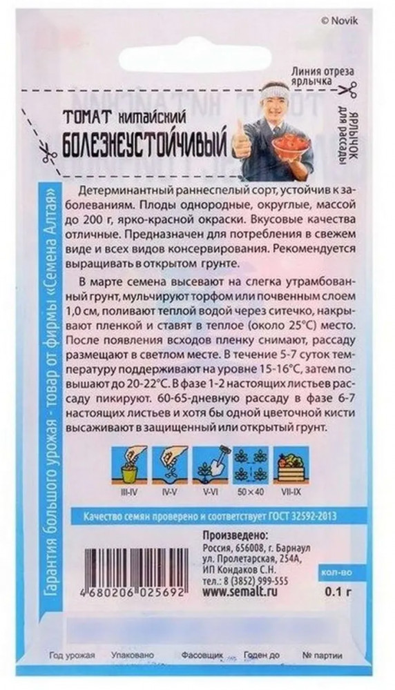 Семена Алтая Томат «Китайский болезнеустойчивый»В данный момент этот товар отсутствует в продаже. Возможно, у нас найдется аналогичный или похожий товар здесь. Детерминантный раннеспелый сорт, устойчив к заболеваниям. Плоды однородные, округлые, массой до 200 г, ярко-красной окраски. Вкусовые качества отличные. Предназначен для потребления в свежем виде и всех видов консервирования. Рекомендуется выращивать в открытом грунте. В марте семена высевают на слегка утрамбованный грунт, мульчируют торфом или почвенным слоем 1 см, поливают теплой водой через ситечко, накрывают пленкой и ставят в теплое (около 25°С) место. После появления всходов пленку снимают, рассаду размещают в светлом месте. В течение 5-7 суток температуру поддерживают на уровне 15-16°С, затем повышают до 20-22°С. В фазе 1-2 настоящих листьев рассаду пикируют. 60-65-дневную рассаду в фазе 6-7 настоящих листьев и хотя бы одной цветочной кисти высаживают в защищенный или открытый грунт с соблюдением посадочного расстояния 40 × 40 см. Детерминантные томаты в открытом грунте формируют в 1-2 стебля, в теплице — в 3-4 стебля. Томаты хорошо отзываются на редкий, но обильный полив. При выращивании в теплице рекомендованы магниевые подкормки по вегетации. В период налива плодов рекомендуется произвести калийную подкормку. Урожай собирают в течение сезона по мере созревания. Недозревшие плоды могут дозариваться не на растении. |