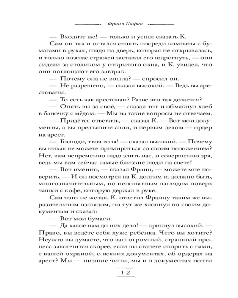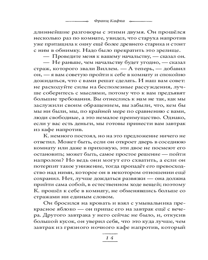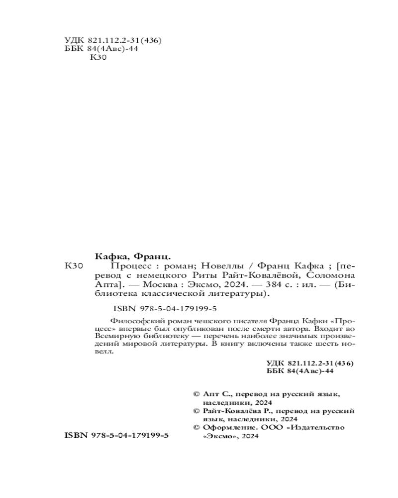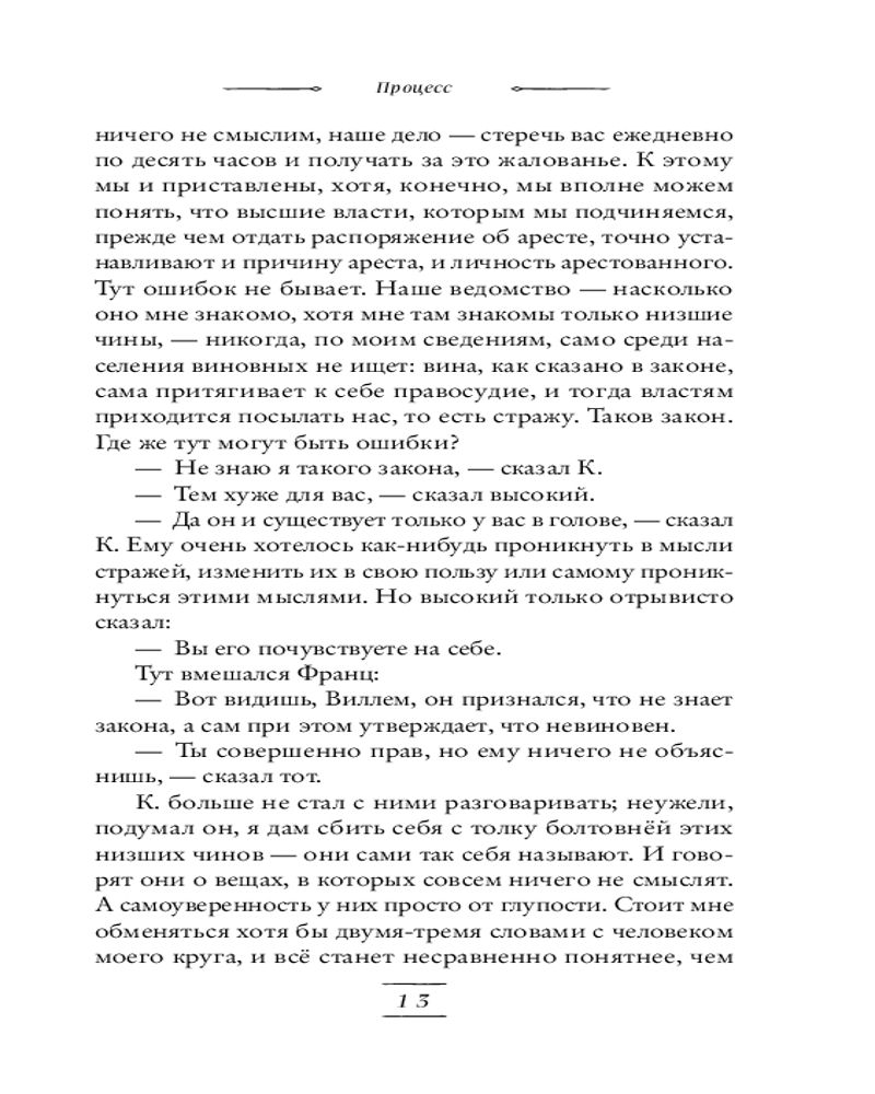 Процесс. НовеллыВ данный момент этот товар отсутствует в продаже. Возможно, у нас найдется аналогичный или похожий товар здесь. Серия: Библиотека классической литературы Роман Франца Кафки «Процесс», согласно завещанию автора, должен был быть сожжён после смерти писателя. К счастью, этого не произошло. В итоге «Процесс» не только стал первой книгой, изданной после смерти Ф. Кафки, но и вошёл во всемирную историю литературы. А поклонники творчества писателя не устают находить и расшифровывать тайные смыслы, скрытые в текстах произведений. Роман «Процесс» и шесть коротких новелл, вошедшие в эту книгу, приглашают читателей в странный, непостижимый мир готического абсурда — может быть, ради новых открытий? «Библиотека классической литературы» — книги, которые помогают найти ответы на самые сложные вопросы! Издание в твёрдом переплёте. |