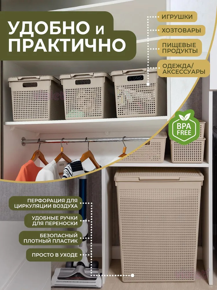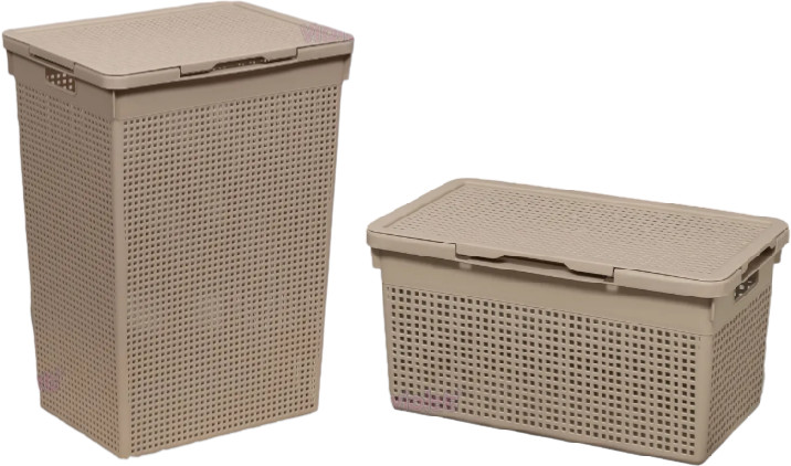 Размеры ящика и устойчивая крышка позволяют поставить корзину одну на другую. Используя такой набор можно организовать систему хранения вещей в шкафу или систему сортировки белья в стирку для семьи, когда белое белье складывается в один контейнер, а цветное — в другой, что заметно облегчит и ускорит сам процесс стирки.