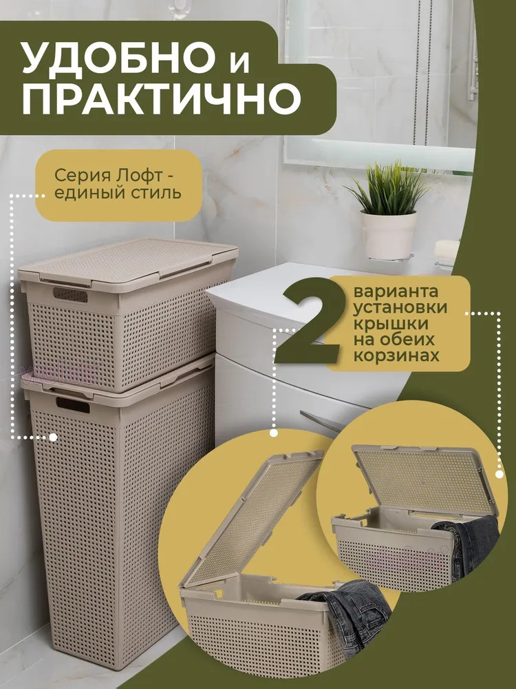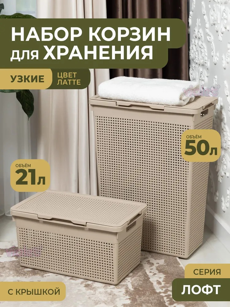Серия: Лофт Набор из 2 узких корзин в стиле Лофт — отличное решение для организации хранения вещей до или после стирки. Корзина для хранения белья с крышкой объемом 50 литров — узкая и компактная, но при этом вместительная пластмассовая бельевая корзина. И наша новинка: корзина с крышкой объемом 21 литр — небольшая низкая корзинка. Оба изделия выполнены из прочного экологичного пластика, не содержащего бисфенол А.