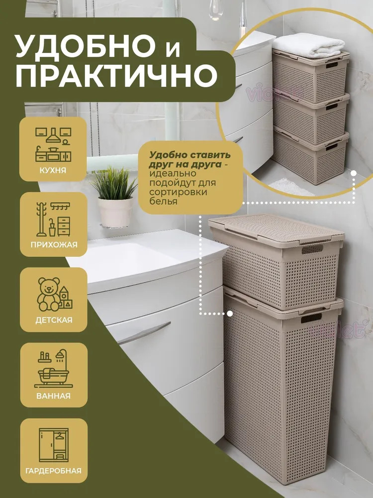 Небольшие габариты контейнера позволят поставить ее в узком месте или ограниченном пространстве ванной комнаты, а также использовать в шкафу в гардеробной, детской комнате, гостиной, спальне, кухне или коридоре. В пластиковом ящике с крышкой можно хранить самые разные вещи: от грязного белья и детских игрушек, до чистых полотенец и бытовой химии. Органайзер не имеет острых углов, а стенки и крышка корзины имеют перфорацию, что обеспечивает хорошую вентиляцию содержимого контейнера. Главное достоинство обеих корзин — два варианта установки крышки: по узкой или широкой стороне, ее можно переставлять как Вам будет удобнее, в зависимости от месторасположения и открывать короб либо с торцевой, либо с фронтальной стороны.