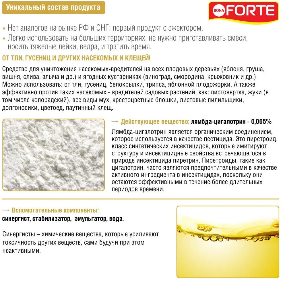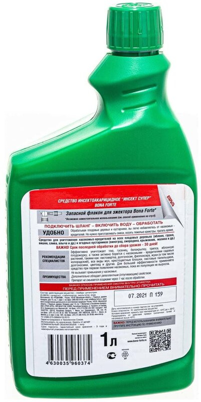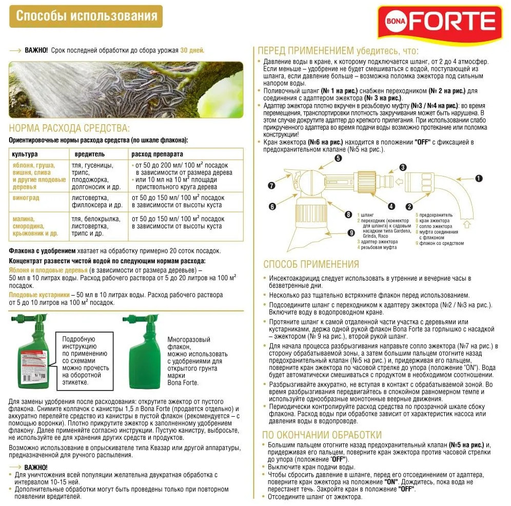 💳 Оплатить за товар можно при получении 🇰🇿 Есть бесплатная доставка по Казахстану от 1 дня 🎁 Копите бонусы с каждой покупки Средство для уничтожения насекомых-вредителей на всех плодовых деревьях (яблоня, груша, вишня, слива, алыча и др.) и ягодных кустарниках (виноград, смородина, крыжовник и др.) Можно использовать: от тли, гусениц, белокрылки, трипса, яблонной плодожорки. Также эффективно против таких насекомых-вредителей садовых растений, как: листовертка, жуки (в том числе колорадский), все виды мух, крестоцветные блошки, листовые пилильщики, долгоносики, цветоед, паутинный клещ. Подходит для обработки плодовых, ягодных и декоративных культур. Обеспечивает защиту от насекомых до 30 дней. Одного флакона хватает до 2 соток посадок. Обладает репеллентным (отпугивающими) свойствами). Не смывается дождем. Максимально удобно: подключить шланг — включить воду — обработать. Возможно использование в опрыскивателе типа Квазар или другой аппаратуры, предназначенной для ручного распыления. |