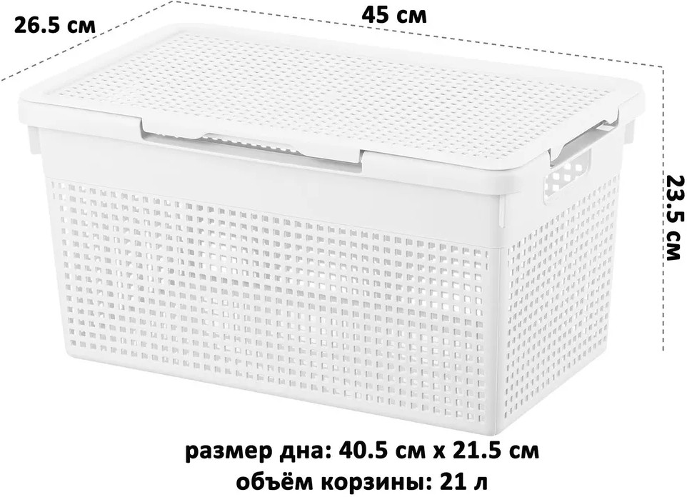 💳 Оплатить за товар можно при получении 🇰🇿 Есть бесплатная доставка по Казахстану от 1 дня 🎁 Копите бонусы с каждой покупки Серия: Лофт В состав набора входят три корзины с крышками объемом 21 литр, размер каждой 45,5х26,5х23,5 см (дно 40,5х21,5 см). Органайзеры выполнены из полипропилена. Преимущество данного материала над обычным пластиком в том, что он легкий по весу и наиболее безопасный для здоровья. В универсальном контейнере белого цвета можно хранить как овощи и фрукты, так и кухонные и хозяйственные принадлежности. Используйте ёмкость для косметики, бытовой химии, моющих средств. Специальное плетение с дырочками позволяет воздуху проникать внутрь и не дает продуктам испортиться от недостатка кислорода. Корзина может быть использована для белья, полотенец и хранения различных мелочей. Такую подставку можно поставить под раковину в ванной, возле стиральной машины или на полку. Ящички можно хранить компактно — один на другом. Используйте в детской комнате как стеллаж или ящик для игрушек. Товары представлены разных объемов, форм и расцветок, что позволит собрать уникальный набор, подходящий под ваши потребности. |