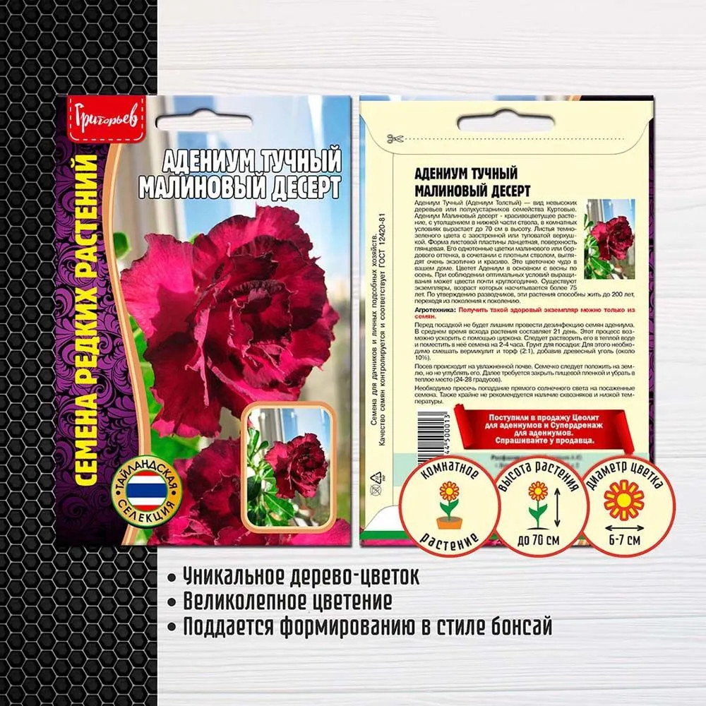 Григорьев Адениум тучный «Малиновый десерт»3+1 В данный момент этот товар отсутствует в продаже. Возможно, у нас найдется аналогичный или похожий товар здесь. Серия: Семена редких растений Адениум тучный (адениум толстый) — вид невысоких деревьев или полукустарников семейства Куртовые. Адениум «Малиновый десерт» — красивоцветущее растение, с утолщением в нижней части ствола, в комнатных условиях вырастает до 70 см в высоту. Листья темно-зеленого цвета с заостренной или туповатой верхушкой. Форма листовой пластины ланцетная, поверхность глянцевая. Его однотонные цветки малинового или бордового оттенка, в сочетании с плотным стволом, выглядят очень экзотично и красиво. Это цветочное чудо в вашем доме. Цветет Адениум в основном с весны по осень. При соблюдении оптимальных условий выращивания может цвести почти круглогодично. Существуют экземпляры, возраст которых насчитывается более 75 лет. По утверждению разводчиков, эти растения способны жить до 200 лет, переходя из поколения к поколению. |