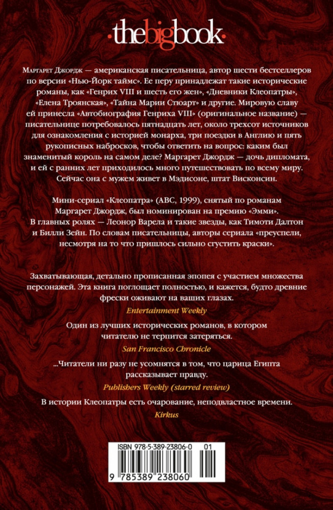 💳 Оплатить за товар можно при получении 🇰🇿 Есть бесплатная доставка по Казахстану от 1 дня 🎁 Копите бонусы с каждой покупки Серия: The Big Book Редкое обаяние сочеталось в ней с властностью, ораторское искусство — с волшебным голосом; она была прекрасно образованна и свободно говорила на многих языках. Жизнь Клеопатры, блистательной царицы Нила, рассказанная от первого лица, разворачивается на страницах дилогии Маргарет Джордж «Дневники Клеопатры» во всех подробностях — трагических и счастливых. В книге второй «Царица поверженная» героиня предстает человеком большой силы духа, умеющим с достоинством принимать неизбежное. |