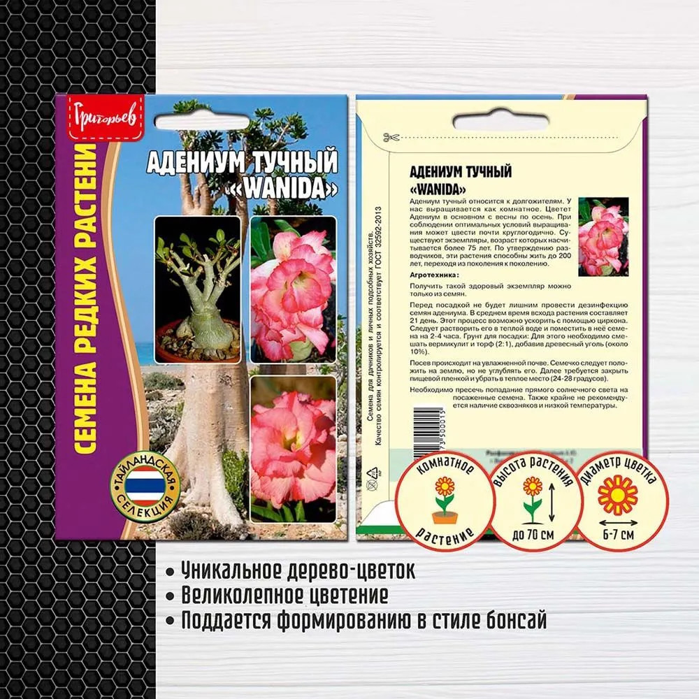 Григорьев Адениум тучный «Siam blueberries»В данный момент этот товар отсутствует в продаже. Возможно, у нас найдется аналогичный или похожий товар здесь. Серия: Семена редких растений Адениум тучный (адениум толстый) — вид невысоких деревьев или полукустарников семейства Куртовые. Листья темно-зеленого цвета с заостренной или туповатой верхушкой. Форма листовой пластины ланцетная, поверхность глянцевая. Его однотонные цветки малинового или бордового оттенка, в сочетании с плотным стволом, выглядят очень экзотично и красиво. Это цветочное чудо в вашем доме. Цветет Адениум в основном с весны по осень. При соблюдении оптимальных условий выращивания может цвести почти круглогодично. Существуют экземпляры, возраст которых насчитывается более 75 лет. По утверждению разводчиков, эти растения способны жить до 200 лет, переходя из поколения к поколению. |
