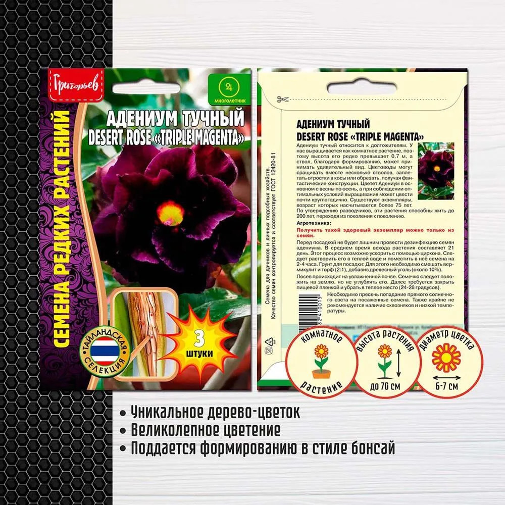Григорьев Адениум тучный desert rose «Triple Magenta»В данный момент этот товар отсутствует в продаже. Возможно, у нас найдется аналогичный или похожий товар здесь. Серия: Семена редких растений Адениум тучный (адениум толстый) — вид невысоких деревьев или полукустарников семейства Куртовые. Листья темно-зеленого цвета с заостренной или туповатой верхушкой. Форма листовой пластины ланцетная, поверхность глянцевая. Его однотонные цветки малинового или бордового оттенка, в сочетании с плотным стволом, выглядят очень экзотично и красиво. Это цветочное чудо в вашем доме. Цветет Адениум в основном с весны по осень. При соблюдении оптимальных условий выращивания может цвести почти круглогодично. Существуют экземпляры, возраст которых насчитывается более 75 лет. По утверждению разводчиков, эти растения способны жить до 200 лет, переходя из поколения к поколению. |
