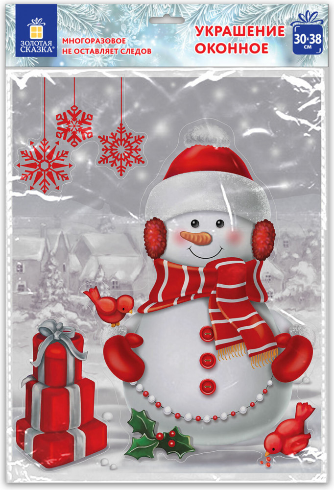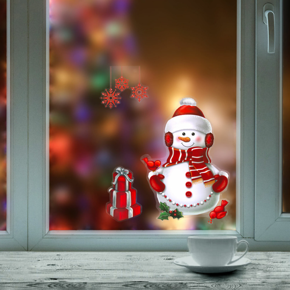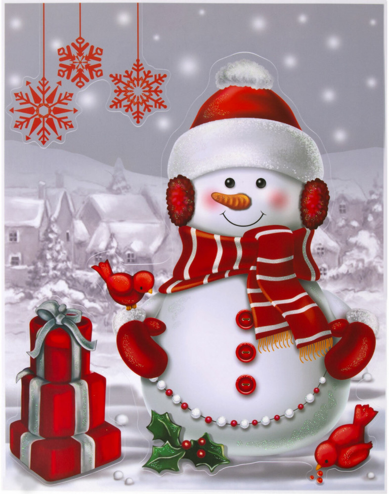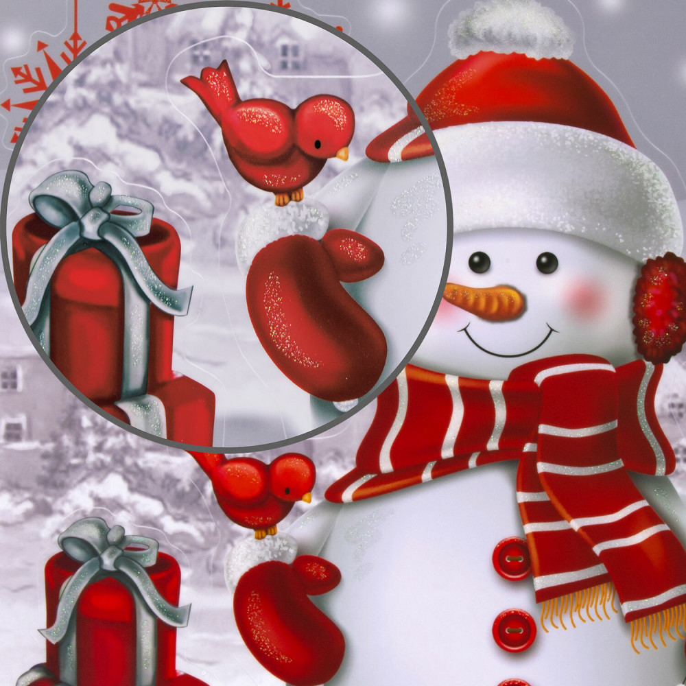 Изделие с изображением снеговика с подарками представляет собой наклейку, изготовленную из поливинилхлорида (ПВХ). Наклейка размером 30×38 см декорирована разноцветным глиттером. Украшение предназначено для декорирования окон, зеркал, стекол и других ламинированных глянцевых поверхностей. Не оставляет клеевых следов и предназначено для многократного использования. Крепится к поверхности посредством статического эффекта.