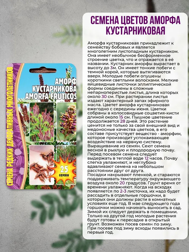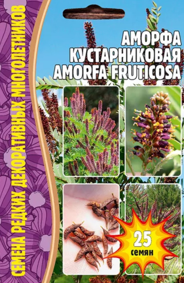 Аморфа кустарниковая (Amorfa fruticosa) принадлежит к семейству бобовых и является многолетним листопадным кустарником. Она имеет необычное бесформенное строение цветка, что и отражается в ее названии. Кустарник аморфы вырастает в высоту до 3 м. Он имеет тонкие побеги с темной корой, которые вытягиваются вверх. Молодые побеги опушены короткими светлыми волосками. Мелкие яйцевидные листочки эллиптической формы соединены в сложные непарноперистые листья, длина которых около 30 см. При растирании листья издают характерный запах эфирного масла.