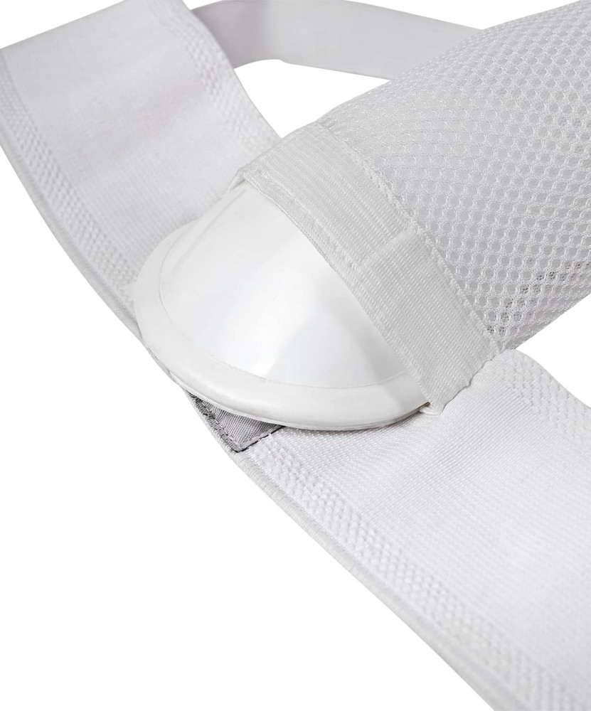 Защита паха PROTEC удобна в использовании. Широкая резинка обеспечивает плотное прилегание и надежно фиксируется на теле благодаря поддерживающим эластичным лентам. Ракушка для единоборств изготовлена из пластика повышенной жесткости, это позволяет обеспечить уверенную защиту данной области даже во время тесного контакта с соперником. В ракушке предусмотрены вентиляционные отверстия для улучшенного воздухообмена. Края пластикового вкладыша покрыты силиконом, чтобы защитить тело от травм во время движения. Ракушка помещена в мешочек из дышащего сетчатого материала. Изделие не требует сложного ухода — прочный пластиковый элемент легко вытащить перед стиркой.