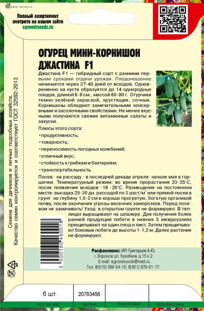 Григорьев Семена. Огурец «Джастина F1»В данный момент этот товар отсутствует в продаже. Возможно, у нас найдется аналогичный или похожий товар здесь. Джастина F1 — гибридный сорт с ранними первыми сроками отдачи урожая. Плодоношение начинается через 37-40 дней от всходов. Одновременно на кусте образуется до 14 однородных плодов, длиной 6-8 см., массой 60-80г. Огурчики темно-зелёной окраской, хрустящие, сочные. Корнишоны обладают замечательными консервными и засолочными свойствами. Не менее вкусными получаются свежие витаминные салаты и закуски. Плюсы этого сорта: продуктивность, товарность, переносимость погодных колебаний, отличный вкус, стойкость к грибкам и бактериям, транспортабельность. Посев: на рассаду — в последней декаде апреля- начале мая в горшочки. Температурный режим: во время прорастания 23-25°С, после появления всходов −18 −20°С. Размещение на постоянном месте: высадка 25-30 дн. рассадой по 3 раст/м2 или прямой посев в грунт на глубину 1,5-2 см в хорошо прогретую, богатую органикой почву, после окончания угрозы весенних заморозков. Перед посевом не замачивать! Уход: в открытом грунте не формируют. В теплицах выращивают на шпалере. Для получения более ранней продукции побеги в нижних 5 междоузлиях прищипывают на один плод и лист. Затем прищипывают боковые побеги до высоты 1-1,2 м. Далее растение не формируют. |
