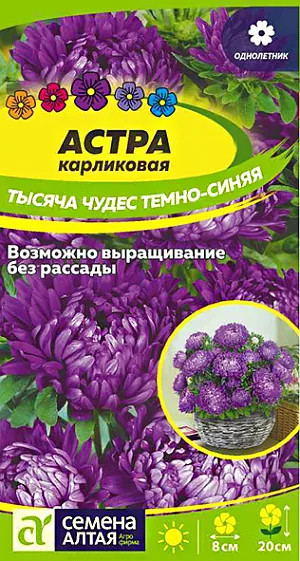 Семена Алтая Астра карликовая «Тысяча чудес темно-синяя»В данный момент этот товар отсутствует в продаже. Возможно, у нас найдется аналогичный или похожий товар здесь. Бордюрная низкорослая астра, одна из самых востребованных. Куст высотой до 20 см весь покрыт крупными махровыми цветками насыщенной фиолетово-синей окраски до 8 см диаметром. Идеально подходит для выращивания в горшечной культуре. Выращивается в смешанных цветниках, партерных клумбах, вазонах, широко используется в качестве бордюрной культуры. Холодостойкое, светолюбивое растение, может расти в полутени. Не выносит переувлажнения и засухи. Хорошо растет на обычной садовой почве без свежей органики, кислые почвы необходимо нейтрализовать известью. |