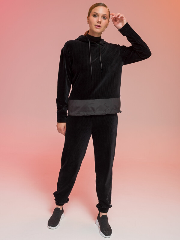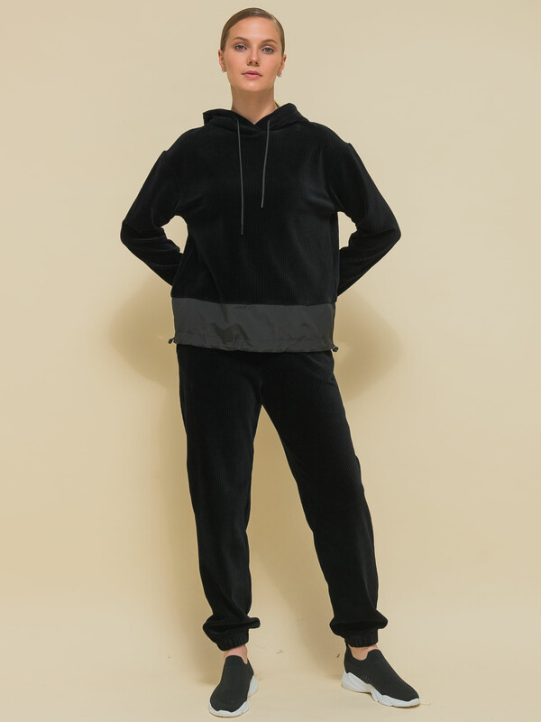 Взяла в комплект к таким же штанам. Заказала на примерку 48 и 50. Начала со своего 48-го (на ОГ96) - подошёл, поэтому 50-й даже не стала примерять, чтобы не портить кайф от распаковки новой вещи другому покупателю. Поскольку нижняя часть с нейлоновой вставкой не тянется, при выборе размера опять же советую ориентироваться на объем бедер. Но ОБ100 эта вставка в 48-м "легла" на бедра со свободой облегания. На ОБ больше будет либо впритык, либо мала. По итогу вышел отличный костюм на межсезонье и прохладные вечера.