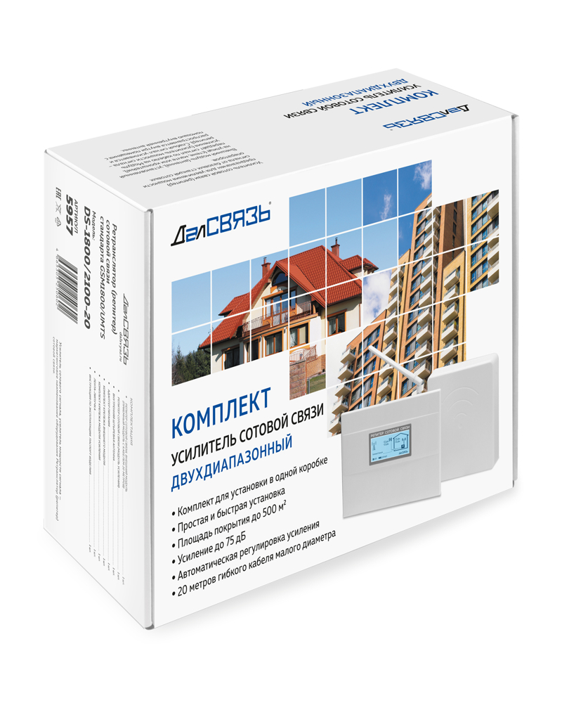 Двухдиапазонный «Smart» комплект DS-900/1800 − 20 мощностью 100 мВт (20 дБм) не требует никаких профессиональных навыков монтажа, имеет полностью автоматизированную настройку параметров. Комплект был спроектирован в целях обеспечения удобства самостоятельной установки и эксплуатации в квартире, загородном доме, небольшом подвальном помещении (до 500 м²).