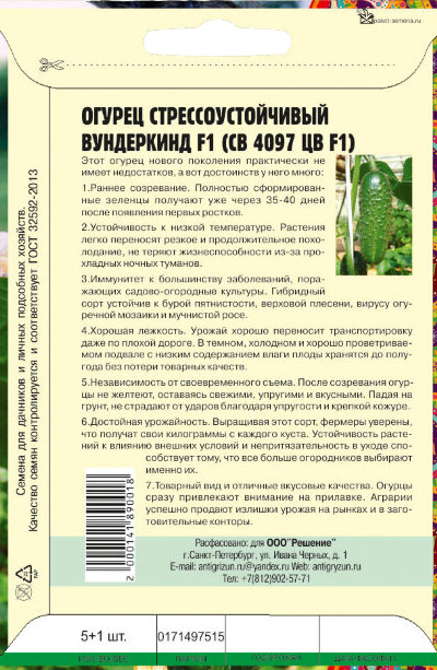 Григорьев Семена. Огурец «Стрессоустойчивый Вундеркинд F1»В данный момент этот товар отсутствует в продаже. Возможно, у нас найдется аналогичный или похожий товар здесь. Этот огурец нового поколения практически не имеет недостатков, а вот достоинств у него много: Раннее созревание. Полностью сформированные зеленцы получают уже через 35-40 дней после появления первых ростков. Устойчивость к низкой температуре. Растения легко переносят резкое и продолжительное похолодание, не теряют жизнеспособности из-за прохладных ночных туманов. Иммунитет к большинству заболеваний, поражающих садово-огородные культуры. Гибридный сорт устойчив к бурой пятнистости, верховой плесени, вирусу огуречной мозаики и мучнистой росе. Хорошая лежкость. Урожай хорошо переносит транспортировку даже по плохой дороге. В темном, холодном и хорошо проветриваемом подвале с низким содержанием влаги плоды хранятся до полугода без потери товарных качеств. Независимость от своевременного съема. После созревания огурцы не желтеют, оставаясь свежими, упругими и вкусными. Падая на грунт, не страдают от ударов благодаря упругости и крепкой кожуре. Достойная урожайность. Выращивая этот сорт, фермеры уверены, что получат свои килограммы с каждого куста. Устойчивость растений к влиянию внешних условий и непритязательность в уходе способствует тому, что все больше огородников выбирают именно их. |