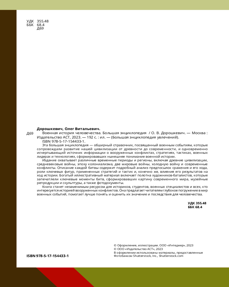 💳 Оплатить за товар можно при получении 🇰🇿 Есть бесплатная доставка по Казахстану от 1 дня 🎁 Копите бонусы с каждой покупки Серия: Большая энциклопедия увлечений В книге представлено подробное описание самых важных сражений в истории человечества, предопределивших ход развития цивилизации и облик современного мира, каким мы его знаем сейчас. К великому сожалению, подобный способ разрешения противоречий люди практикуют с древнейших времен и до наших дней, а прослеживающаяся тенденция превращения глобальных конфликтов в локальные вовсе не умаляет всех тех страданий, жертв и разрушений, которые они с собой несут. |
