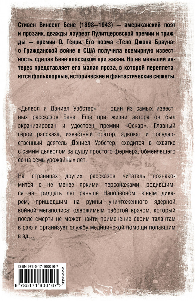 💳 Оплатить за товар можно при получении 🇰🇿 Есть бесплатная доставка по Казахстану от 1 дня 🎁 Копите бонусы с каждой покупки Серия: Вселенная Стивена Кинга «Дьявол и Дэниел Уэбстер» — один из самых известных рассказов Бене. Еще при жизни автора он был экранизирован и удостоен премии «Оскар». Главный герой рассказа, известный оратор, адвокат и государственный деятель Дэниел Уэбстер, сходится в схватке с самим дьяволом за душу простого фермера, обменявшего ее на семь урожайных лет. |