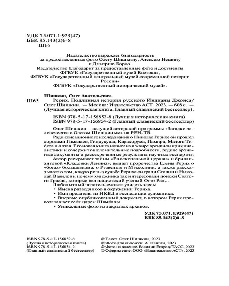 💳 Оплатить за товар можно при получении 🇰🇿 Есть бесплатная доставка по Казахстану 🎁 Копите бонусы с каждой покупки Серия: Главный славянский бестселлер Олег Шишкин — ведущий авторской программы «Загадки человечества с Олегом Шишкиным» на РЕН-ТВ. Ради сенсационного исследования о Николае Рерихе он прошел дорогами Гималаев, Гиндукуша, Каракорума, Памира, Малого Тибета и Алтая. Его новая книга написана в жанре архивной криминалистики и содержит ошеломительные подробности, редкие архивные документы и рассекреченные результаты научных экспертиз. |