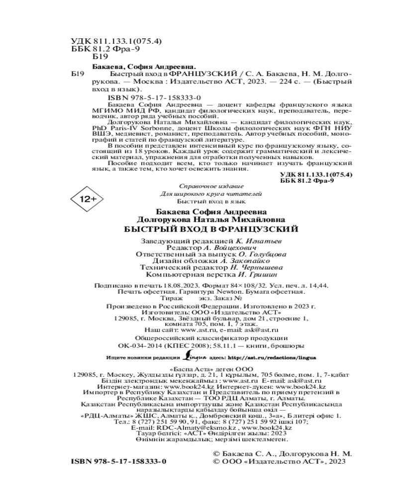 💳 Оплатить за товар можно при получении 🇰🇿 Есть бесплатная доставка по Казахстану от 1 дня 🎁 Копите бонусы с каждой покупки Серия: Быстрый вход в язык Бакаева София Андреевна — доцент кафедры французского языка МГИМО МИД РФ, кандидат филологических наук, преподаватель, переводчик, автор ряда учебных пособий. |