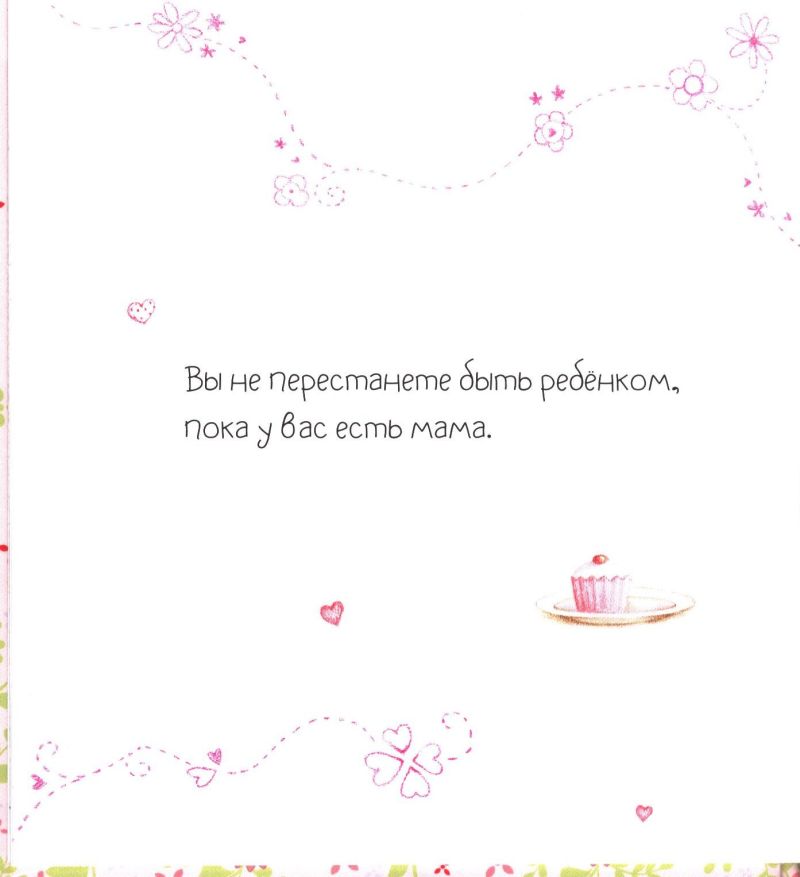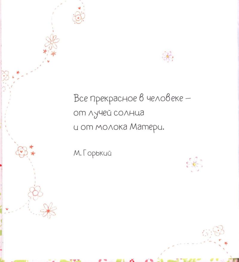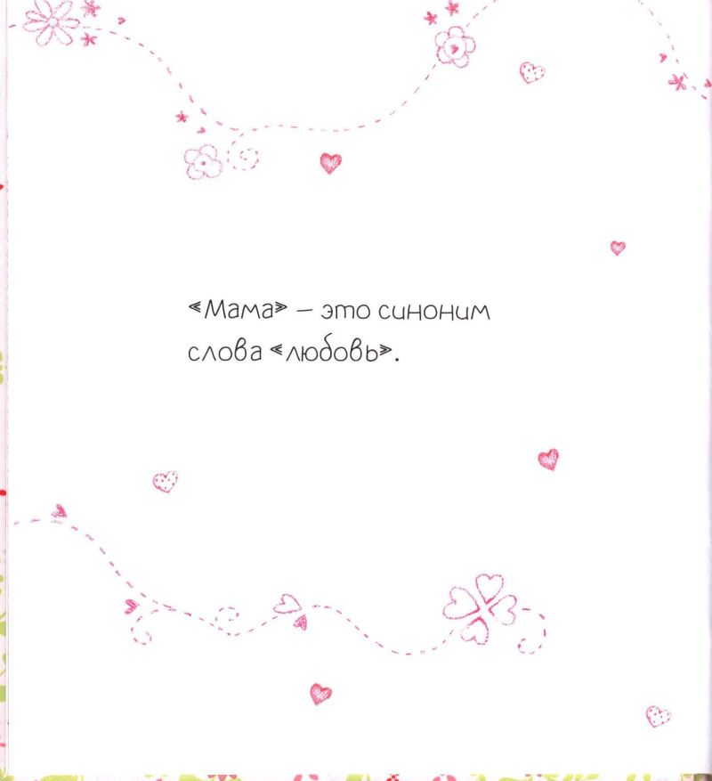 Отличный "довесок" к подарку. Пухленькая обложка, плотная, хорошая бумага, четкие иллюстрации. На каждом развороте, с одной стороны - цитата о маме, с другой - картинка с очаровательным мишкой (картинки разные). Трогательная и милая книжка. Но довольно тонкая. И еще, ввиду хорошего качества бумаги, и достаточного количества свободного места, можно на каждой странице дописать что-то от себя или приклеить небольшое фото...По цене - не дороже открытки, но намного интереснее. Рекомендую