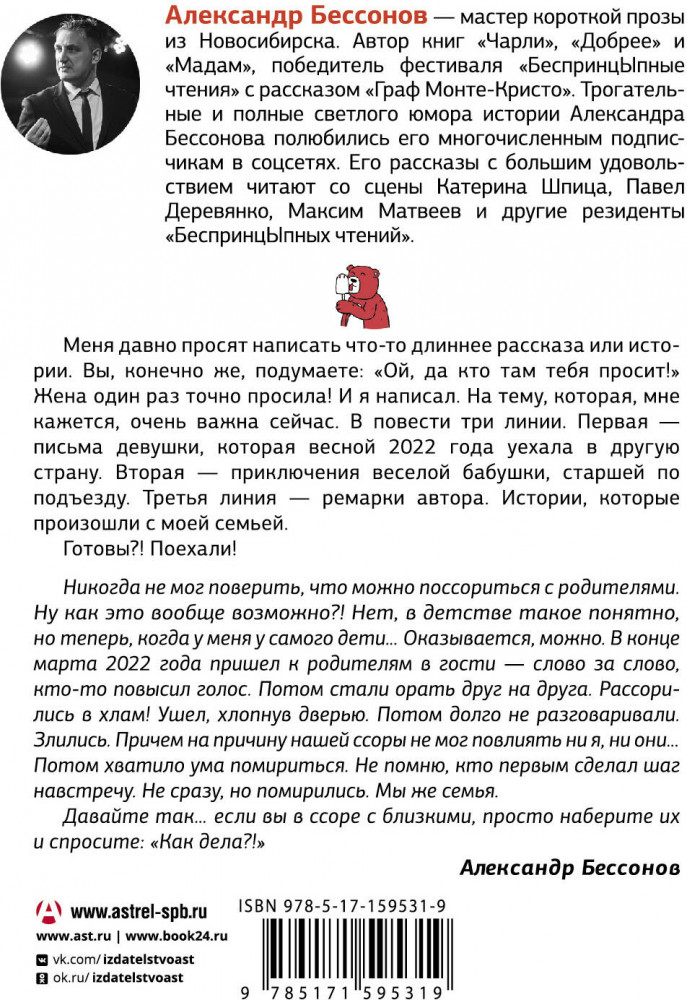 💳 Оплатить за товар можно при получении 🇰🇿 Есть бесплатная доставка по Казахстану от 1 дня 🎁 Копите бонусы с каждой покупки Серия: Одобрено Рунетом В четвертом сборнике Александра Бессонова — повесть в историях и письмах «Старшая по подъезду» и ранее не публиковавшиеся, но уже популярные, рассказы, прочитанные со сцены Павлом Деревянко, Максимом Матвеевым и другими резидентами литературно-театрального проекта «БеспринцЫпные чтения». |