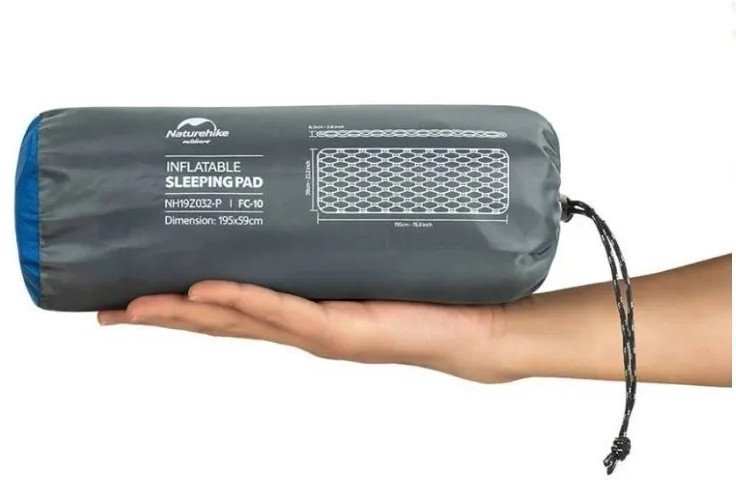 Облегченная модель весит всего 580 грамм. Размеры в разложенном положении достигают 198×59×6,5 сантиметров. В комплект с ковриком сложена портативная сумка для хранения размером 9,5×28 сантиметров. Надувной коврик удобно переносить в рюкзаке и, в отличие от пенки, он не занимает много места. Насос к коврику нужно докупать отдельно.