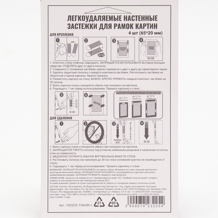 С помощью клейкие застежки Мой выбор ( липучки, крючки на стену, крепеж, полоски) можно легко и безопасно крепить разнообразные аксессуары на вертикальной поверхности. Вы не портите стены, не шумите, не сверлите, никаких лишних движений. При необходимости можно удалить, потянув за клейкую полоску. Благодаря настенным застежкам можно эстетично крепить к стене все что угодно соблюдая весовую нагрузку — роутер, часы, полки, рамки, картины. Одна застежка фиксируется на стене, а другая — на раме. Именно поэтому Вы можете вешать и снимать Ваши фотографии, предметы интерьера столько раз сколько пожелаете. Соблюдайте инструкцию по применению на оборотной стороне упаковки! Подходит для твердых, ровных поверхностей и окрашенных стен. Не подходит для бумажных или виниловых обоев, шероховатых поверхностей.