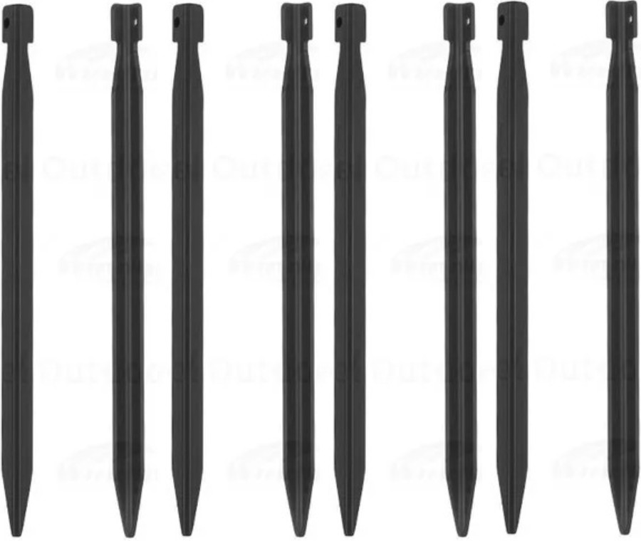 Черный цвет деталей сочетается с любым цветом палатки. В одном комплекте идут 8 сменных колышек длиной 20 сантиметров. Один колышек весит 17 грамм, а в сумме вес набора выходит примерно 136 грамм. Если вы не уверены в погодных условиях или заранее не изучили местность, рекомендуем позаботиться об устойчивой вашей установки палатки.