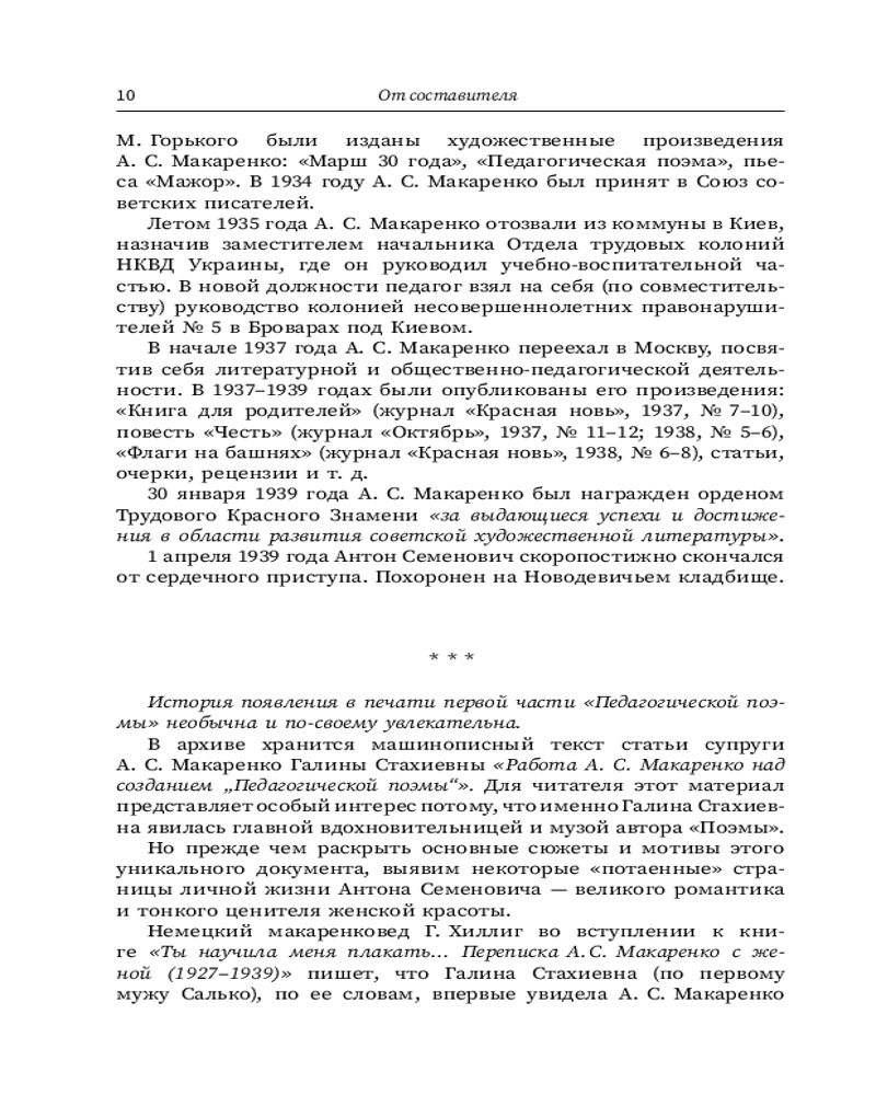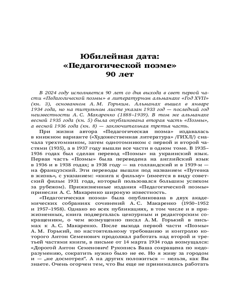 Данное издание «Педагогической поэмы» — полное, восстановленное, свободное от цензурных купюр. Произведение получило всемирную известность, в нем увлекательно и с документальной точностью описан опыт автора по созданию Колонии им. Горького и руководства ею в 20-х годах прошлого века.