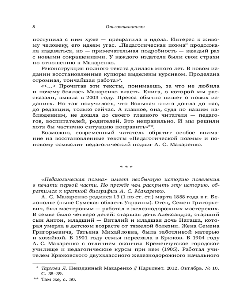 Данное издание — полное, восстановленное, свободное от цензурных купюр. В книгу включено объемное вступление С. С. Невской — специалиста по изучению наследия А. С. Макаренко, добавлены удаленные в первых изданиях «Поэмы» части глав, восстановленные по прижизненным изданиям и рукописи, приведены расширенные комментарии и пояснения.