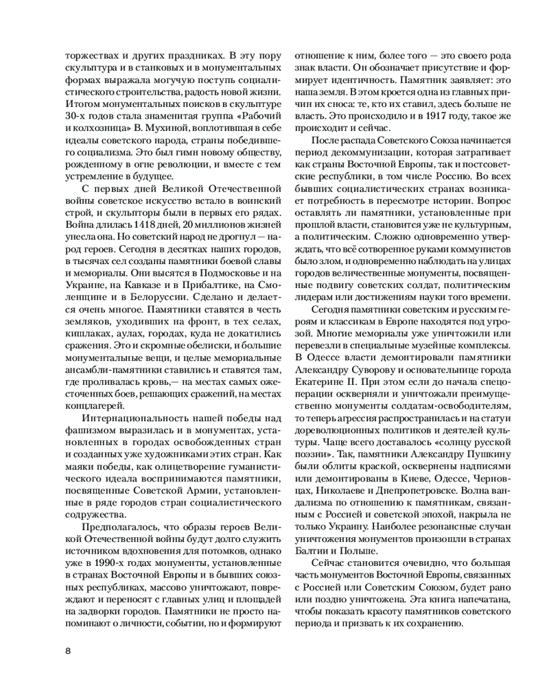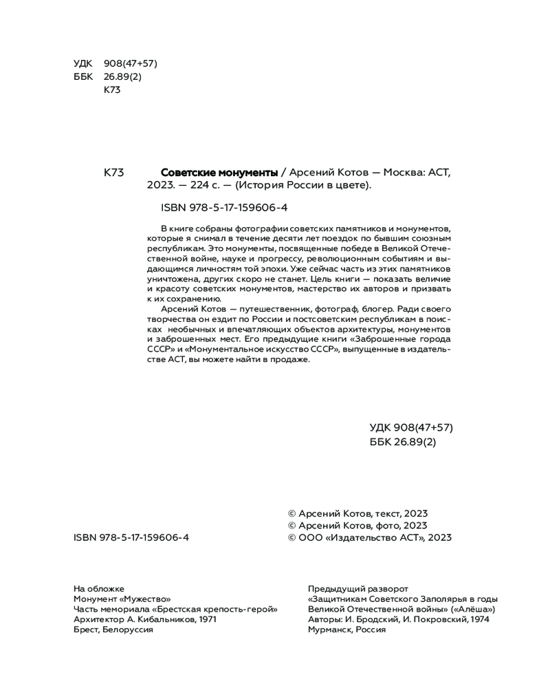 💳 Оплатить за товар можно при получении 🇰🇿 Есть бесплатная доставка по Казахстану от 1 дня 🎁 Копите бонусы с каждой покупки Серия: История России в цвете В книге собраны фотографии советских памятников и монументов, которые я снимал в течение десяти лет поездок по бывшим союзным республикам. Это монументы, посвященные победе в Великой Отечественной войне, науке и прогрессу, революционным событиям и выдающимся личностям той эпохи. Уже сейчас часть из этих памятников уничтожена, других скоро не станет. Цель книги — показать величие и красоту советских монументов, мастерство их авторов, и призвать к их сохранению. |