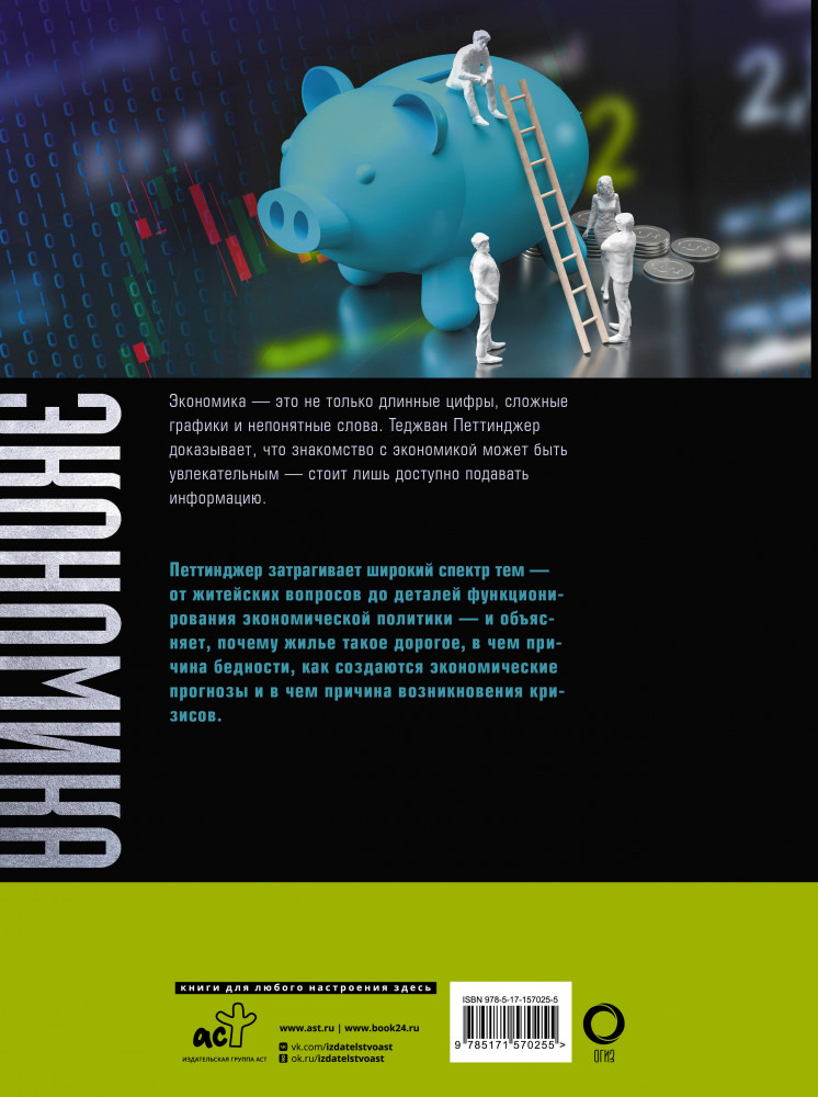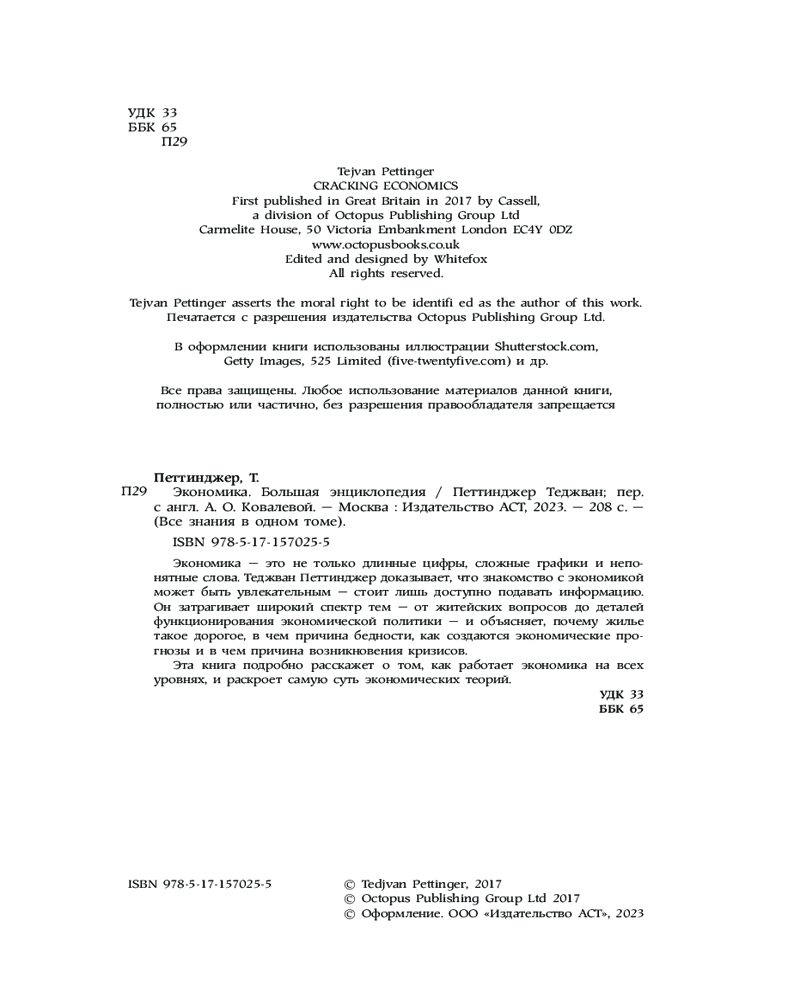 Экономика. Большая энциклопедияВ данный момент этот товар отсутствует в продаже. Возможно, у нас найдется аналогичный или похожий товар здесь. Серия: Все знания в одном томе Экономика — это не только длинные цифры и сложные графики. Она состоит из множества увлекательных историй и интересных теорий. Эта книга подробно рассказывает о том, как работает экономика на всех уровнях. Она объясняет, почему жилье такое дорогое, в чем причина бедности, как создаются экономические прогнозы, раскрывая самую суть экономических теорий. Возможно, мысли Адама Смита, Карла Маркса, Джона Кейнса и многих других помогут вам по-новому взглянуть на мир денег и понять его суть. |