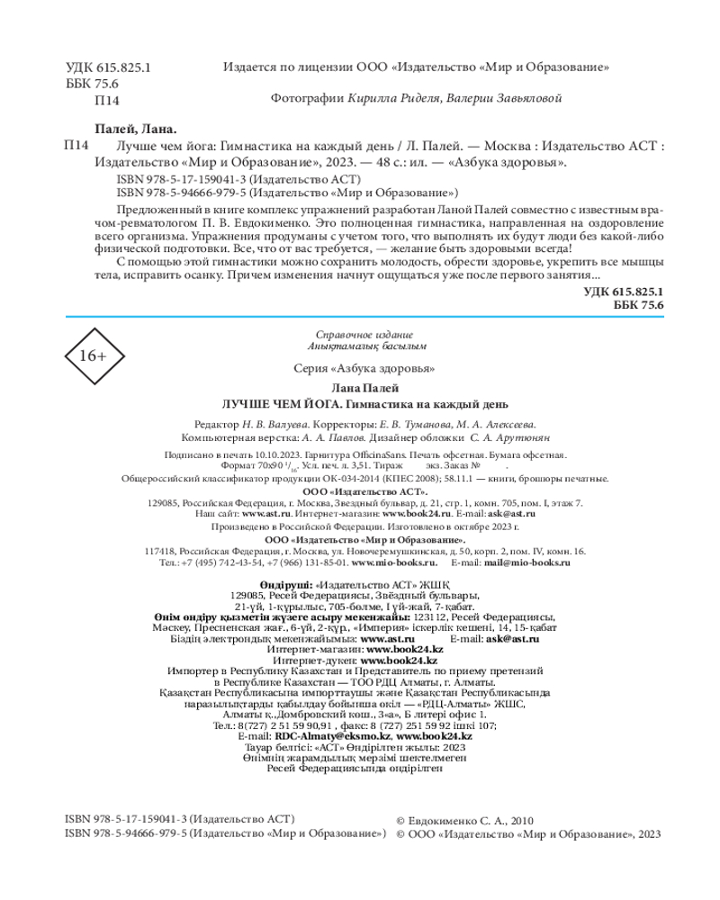 💳 Оплатить за товар можно при получении 🇰🇿 Есть бесплатная доставка по Казахстану от 1 дня 🎁 Копите бонусы с каждой покупки Серия: Азбука здоровья Упражнения из из специальной гимнастики Ланы Палей помогают проработать спину и исправить осанку. Помогают улучшить работу внутренних органов и оздоровить весь организм в целом. |