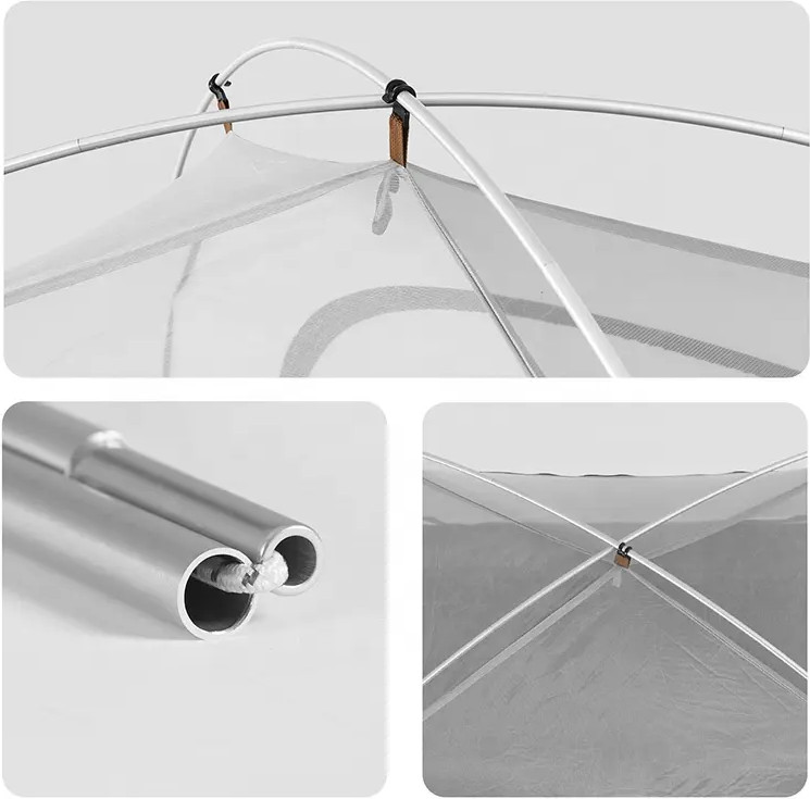 Каркас изготовлен из прочного алюминия. Крестообразная конструкция надежно держит форму, поэтому палатка не шатается даже в ветреную погоду. Чуть закругленные части каркаса увеличивают место в палатке, поднимая высоту потолка на несколько сантиметров. Двухслойный тент из полиэстера 210T надежно защищает от сквозняков и дождливой погоды. Сетчатый тент, который выступает в качестве подкладки и москитной сетки, можно использовать отдельно от верхнего слоя. В теплую погоду это добавит особую атмосферу в путешествие и позволит отдыхать под открытым небом.