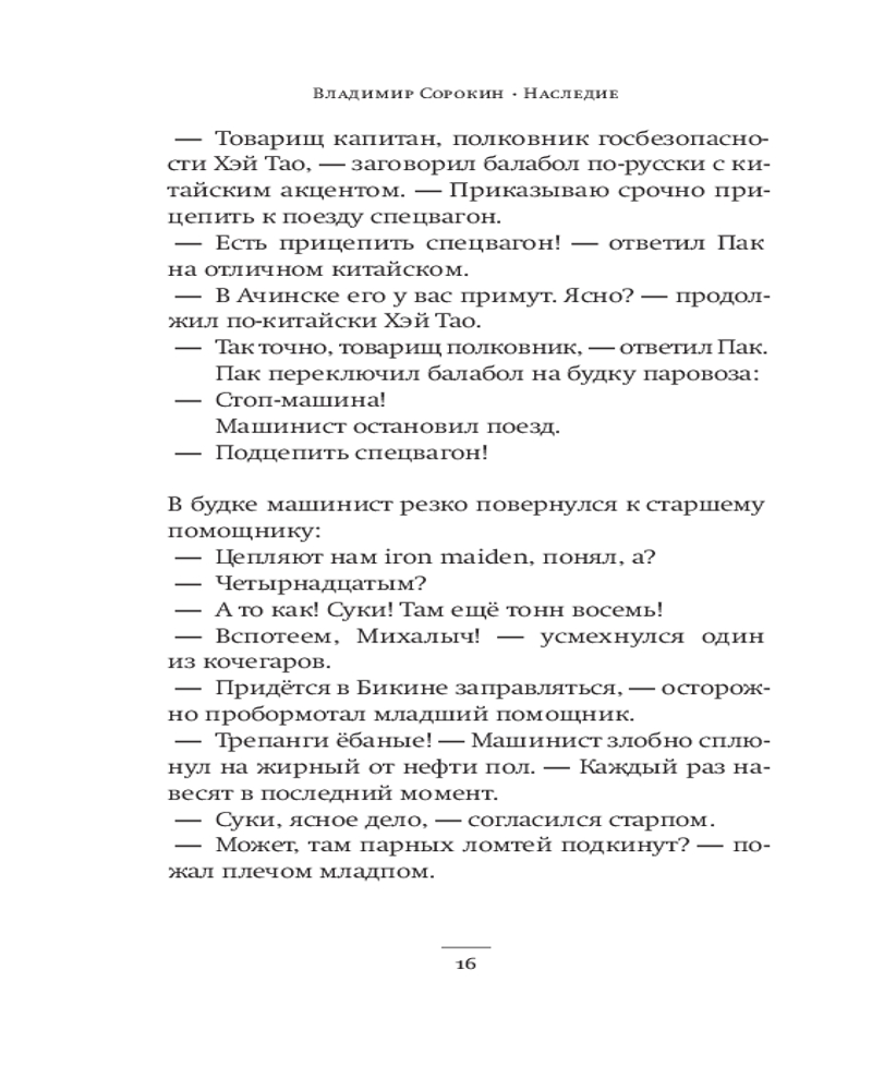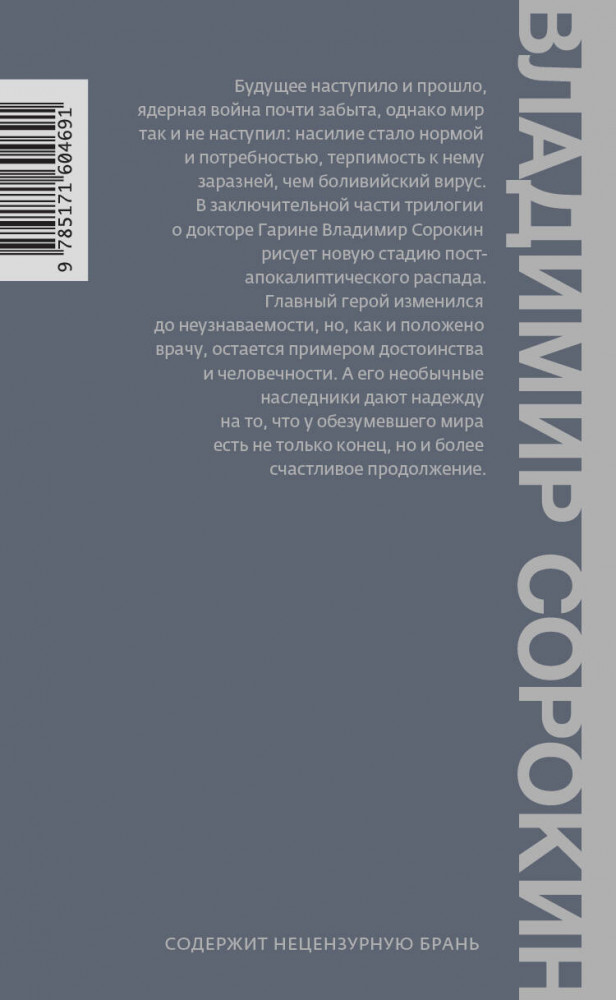 НаследиеВ данный момент этот товар отсутствует в продаже. Возможно, у нас найдется аналогичный или похожий товар здесь. Серия: Весь Сорокин Будущее наступило и прошло, ядерная война почти забыта, выжили не все, а тот, кто выжил, уже никогда не будет прежним. Мирный договор не привел к миру: насилие стало нормой и потребностью, терпимость к нему заразней, чем боливийский вирус. |