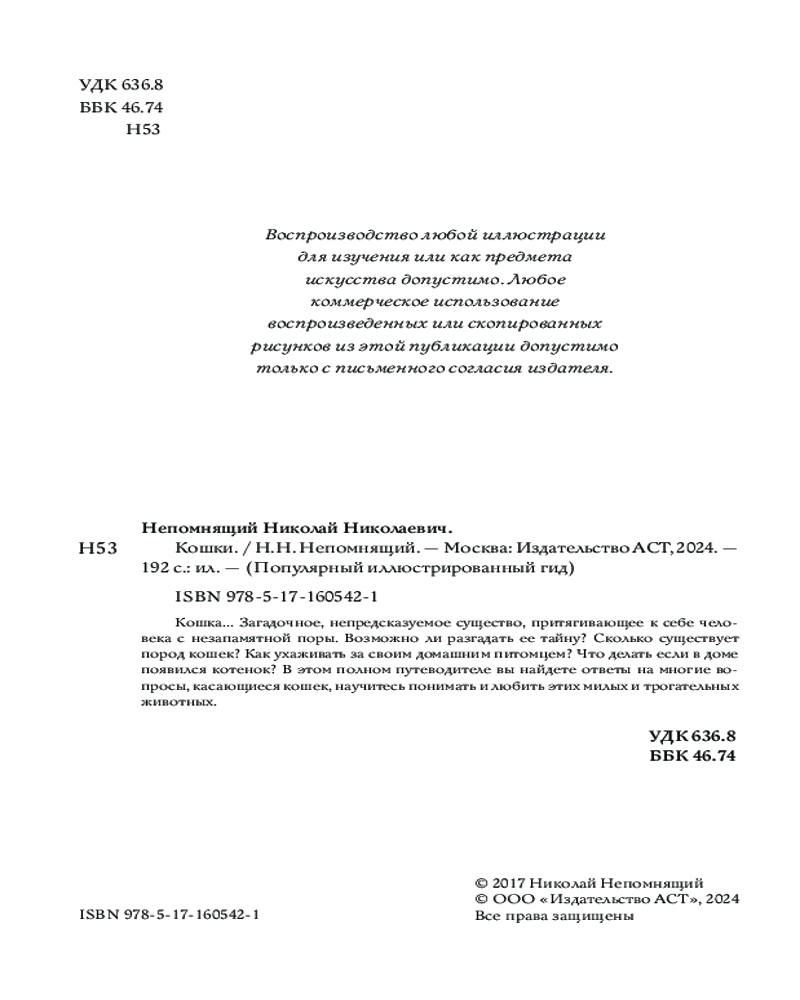 💳 Оплатить за товар можно при получении 🇰🇿 Есть бесплатная доставка по Казахстану 🎁 Копите бонусы с каждой покупки Серия: Популярный иллюстрированный гид Кошка... Грациозный маленький хищник и самый популярный домашний питомец, о котором, кажется, мы знаем все. Но так ли это? Это загадочное, непредсказуемое существо, притягивающее к себе человека с незапамятной поры. Возможно ли разгадать ее тайну? Сколько существует пород кошек? Как ухаживать за своим домашним питомцем? Как вырастить здорового котенка? |