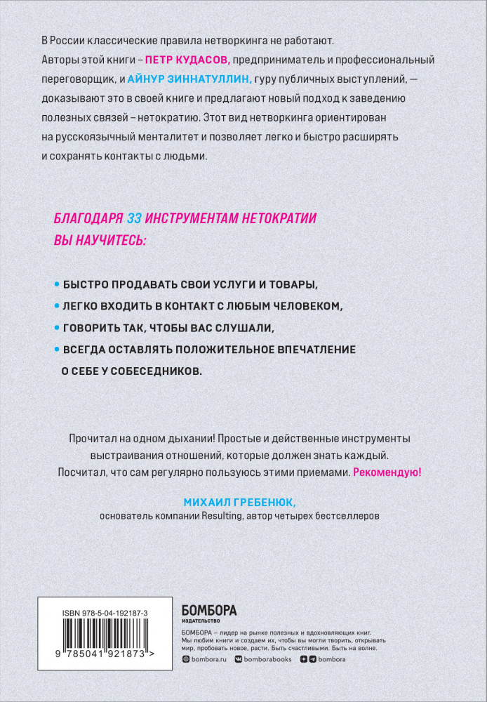 💳 Оплатить за товар можно при получении 🇰🇿 Есть бесплатная доставка по Казахстану от 1 дня 🎁 Копите бонусы с каждой покупки Серия: Психология общения. Новое оформление Авторы этой книги — Петр Кудасов, предприниматель и профессиональный переговорщик, и Айнур Зиннатуллин, гуру публичный выступлений — доказывают это в своей книге и предлагают новый подход к заведению полезных связей — нетократию. Этот вид нетворкинга ориентирован на русскоязычный менталитет и позволяет легко и быстро расширять и сохранять контакты с людьми. |