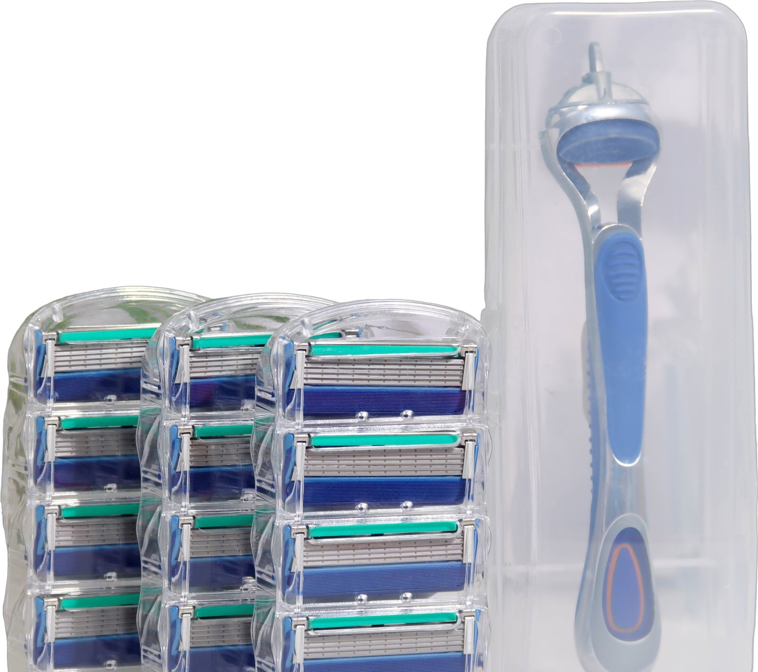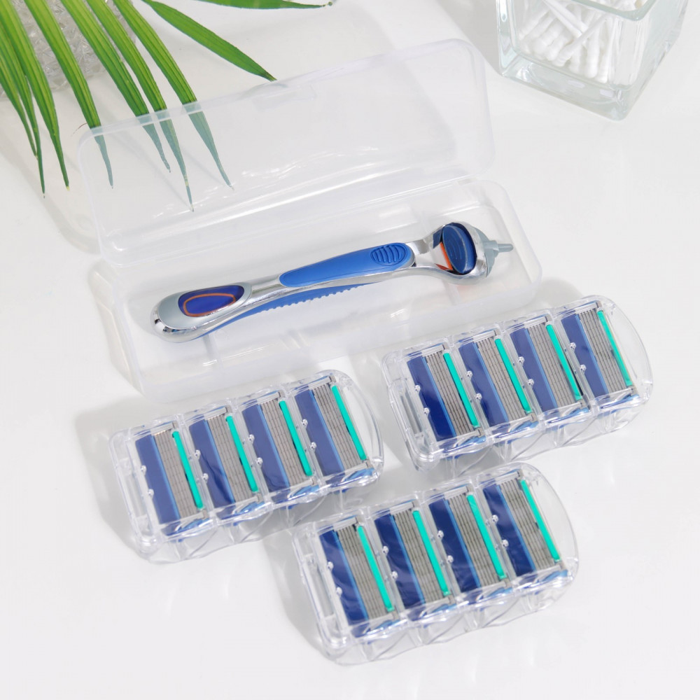 Бритвенный станок с пятью лезвиями и увлажняющей полоской, в наборе 12 сменных кассет лезвий.