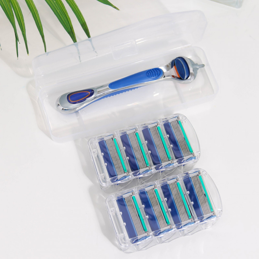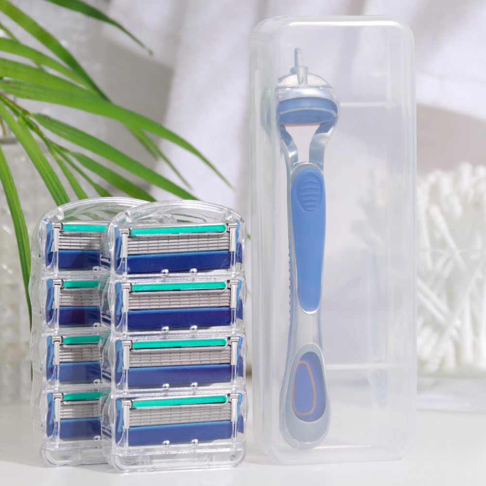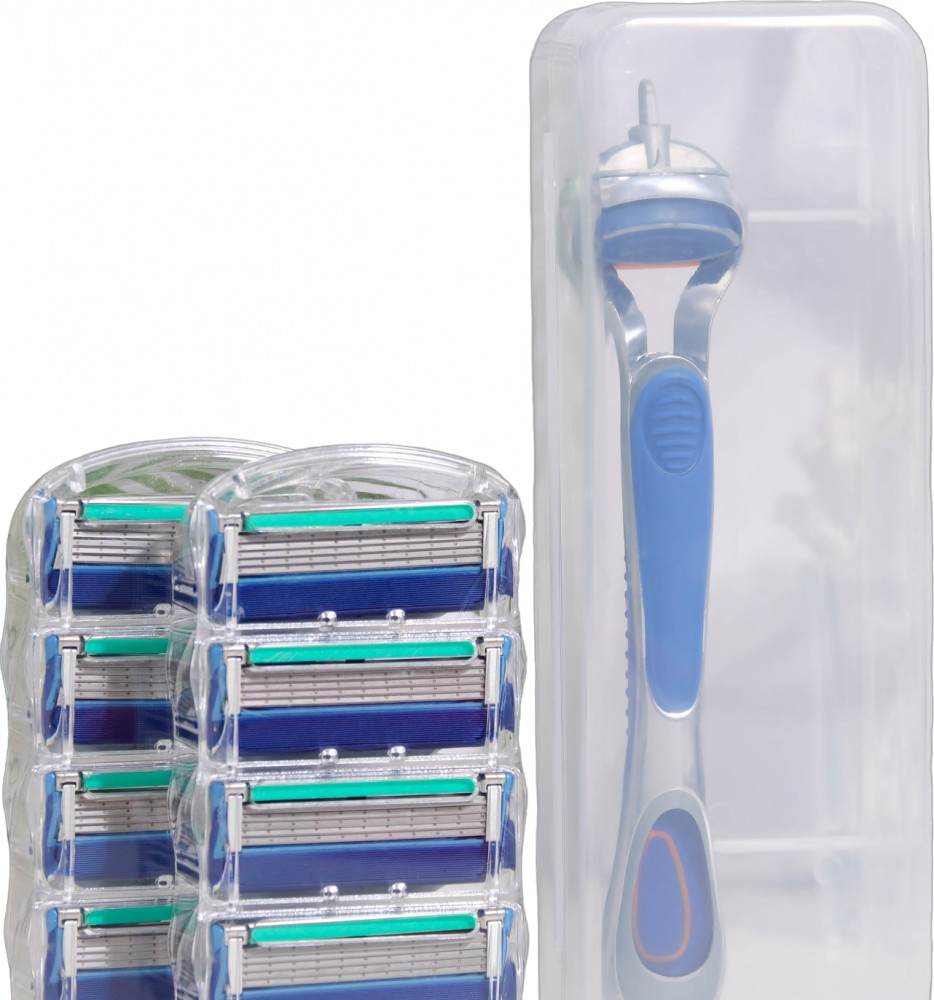 Бритвенный станок с пятью лезвиями и увлажняющей полоской, в наборе 12 сменных кассет лезвий.
