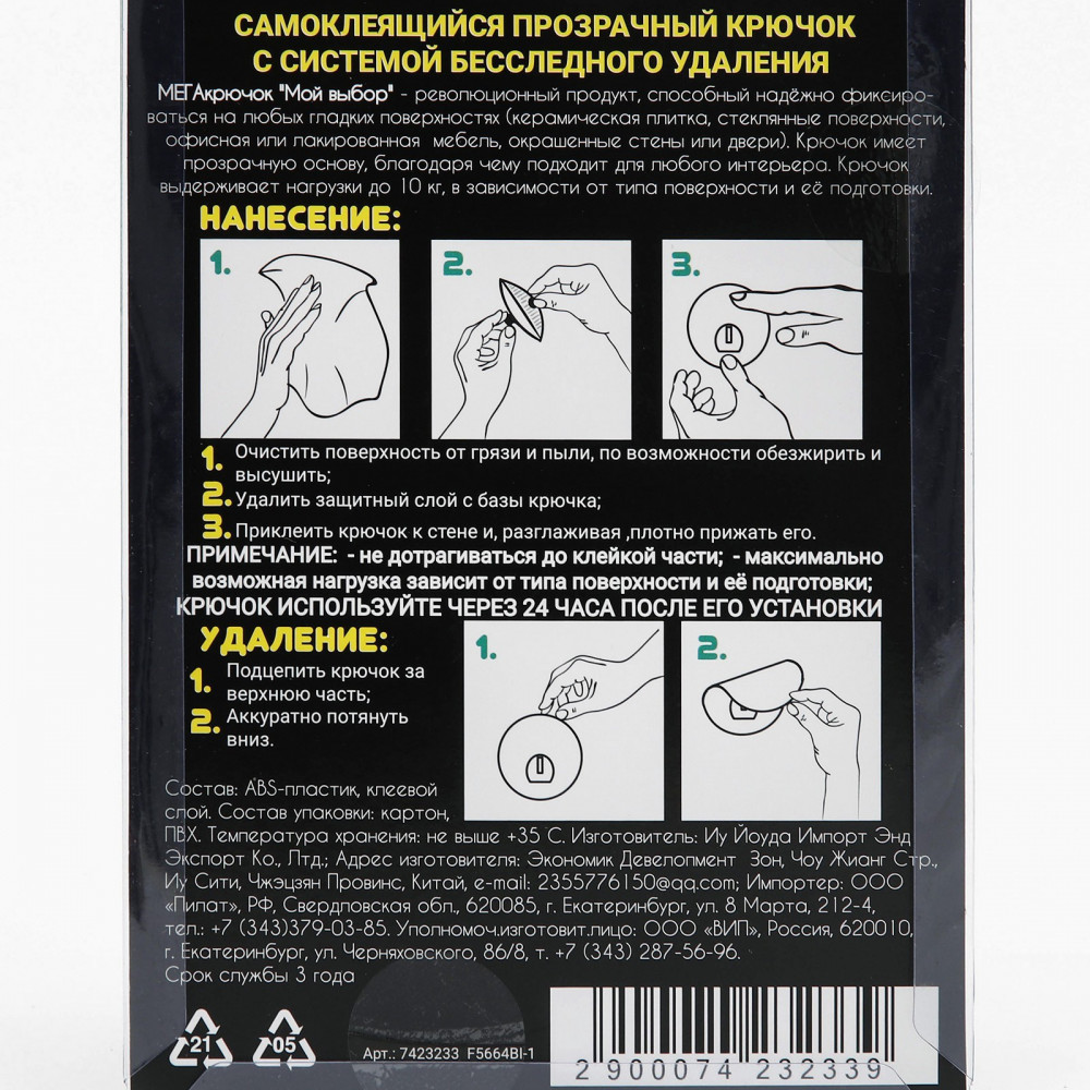 Мой выбор Крючок самоклеящийсяВ данный момент этот товар отсутствует в продаже. Возможно, у нас найдется аналогичный или похожий товар здесь. Самоклеящийся МегаКрючок с системой бесследного удаления и высокими характеристиками по нагрузке. Благодаря своей прозрачной основе крючка практически не заметен на поверхности, не портит внешний вид интерьера. Отлично подходит для кухни и ванной комнаты. Рекомендуются к приклеиванию на кафель, пластик, гладкую и прочную (не пыльную) основу, крашенную стену, некоторые виды обоев. |
