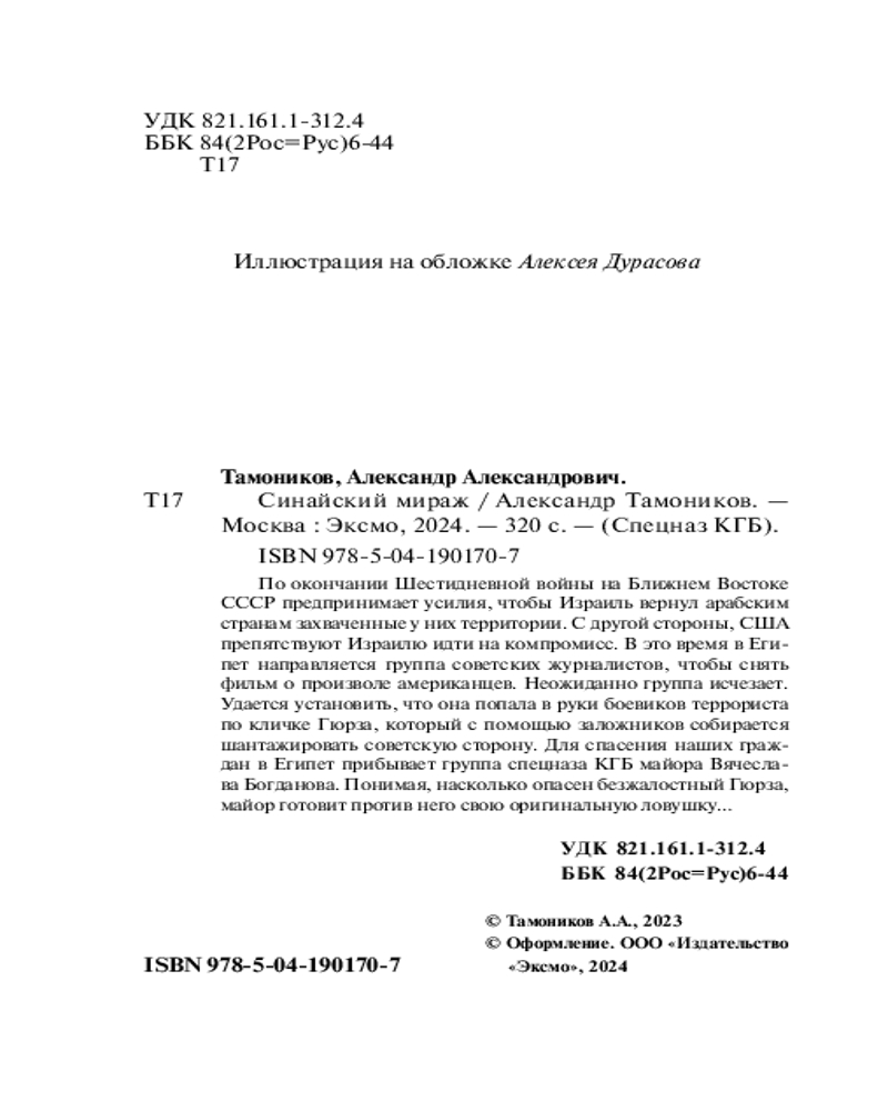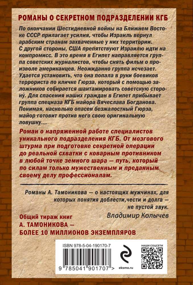 Синайский миражАлександр Александрович Тамоников В данный момент этот товар отсутствует в продаже. Возможно, у нас найдется аналогичный или похожий товар здесь. Серия: Спецназ КГБ (обложка) По окончании Шестидневной войны на Ближнем Востоке СССР принимает усилия, чтобы Израиль вернул арабским странам захваченные у них территории. С другой стороны США препятствуют Израилю идти на компромисс. В это время в Египет направляется группа советских журналистов, чтобы снять фильм о произволе американцев. Неожиданно группа исчезает. Удается установить, что она попала в руки боевиков террориста по кличке Гюрза, который с помощью заложников собирается шантажировать советскую сторону. Для спасения наших граждан в Египет прибывает группа спецназа КГБ майора Вячеслава Богданова. Понимая, насколько опасен безжалостный Гюрза, майор готовит против него свою оригинальную ловушку... |