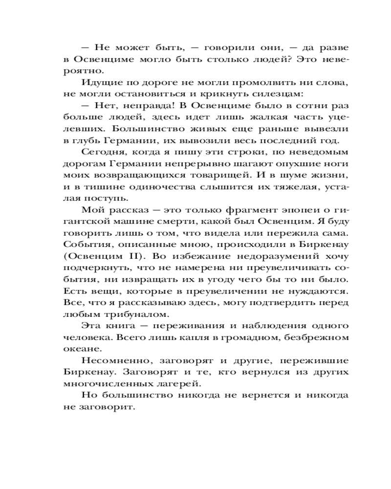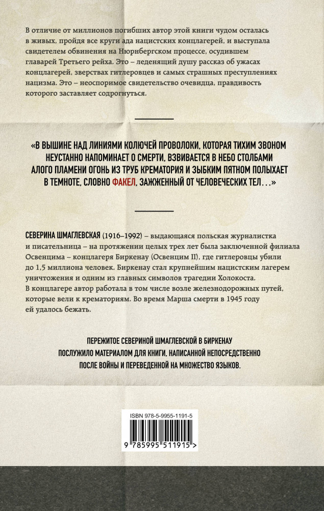 💳 Оплатить за товар можно при получении 🇰🇿 Есть бесплатная доставка по Казахстану от 1 дня 🎁 Копите бонусы с каждой покупки Серия: Холокост. Свидетельства очевидцев В отличие от миллионов погибших, автор этой книги чудом осталась в живых, пройдя все круги ада нацистских концлагерей, и выступала свидетелем обвинения на Нюрнбергском процессе, осудившем главарей Третьего рейха. Это — леденящий душу рассказ об ужасах концлагерей, зверствах гитлеровцев и самых страшных преступлениях нацизма. Это — неоспоримое свидетельство очевидца, правдивость которого заставляет содрогнуться. |