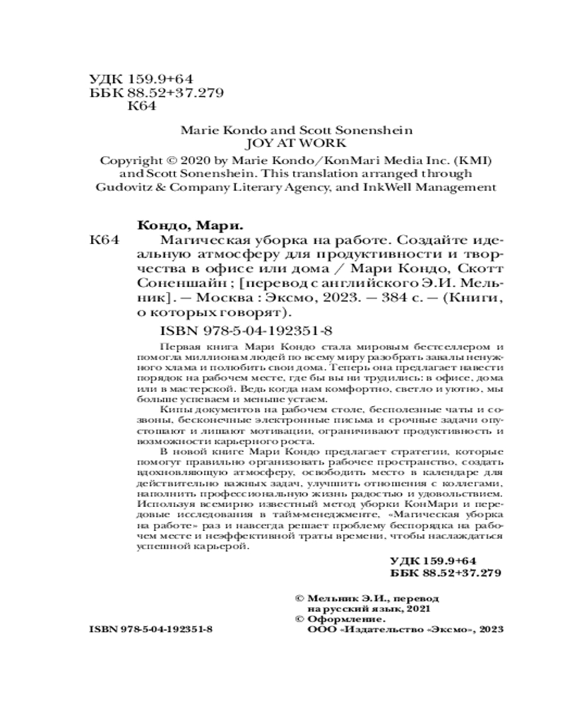 💳 Оплатить за товар можно при получении 🇰🇿 Есть бесплатная доставка по Казахстану от 1 дня 🎁 Копите бонусы с каждой покупки Серия: Книги, о которых говорят 6 лет назад вышла книга улыбчивой японки Мари Кондо, которая помогла миллионам людей по всему миру разобрать завалы ненужного хлама в квартирах и полюбить свои дома. Только в России книгу «Магическая уборка» купили более 500 000 раз! Теперь Мари Кондо предлагает навести порядок на рабочем месте, чтобы создать идеальную атмосферу для продуктивности и творчества. Работа в радость? Нет ничего проще с методом КонМари. |