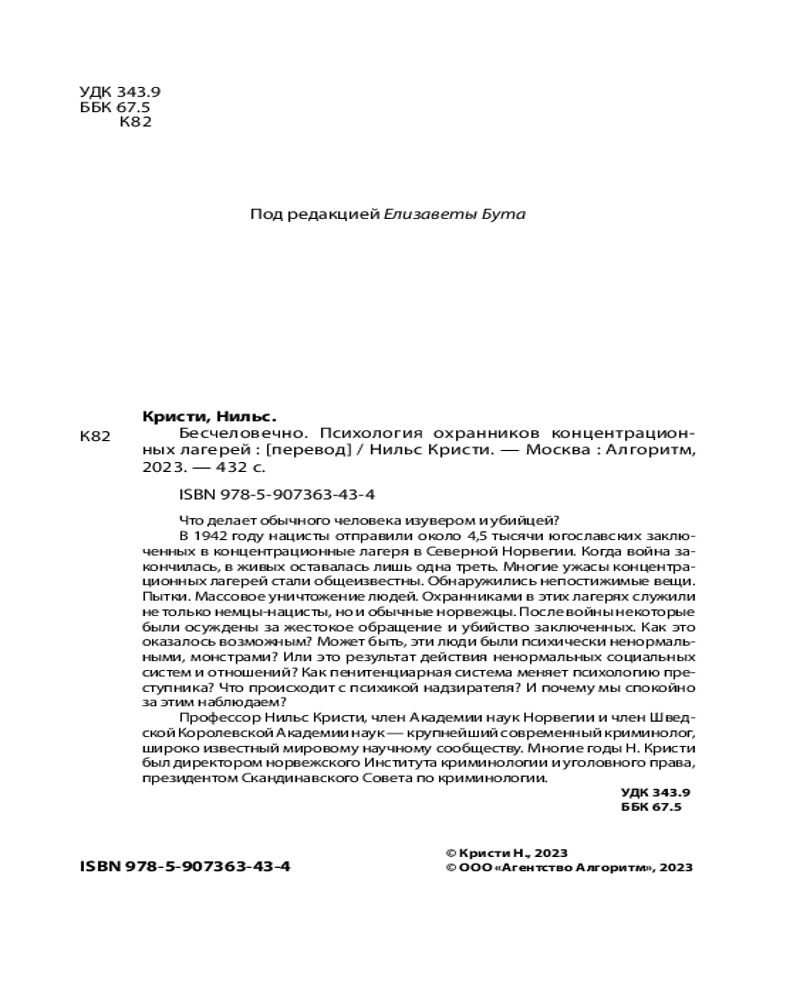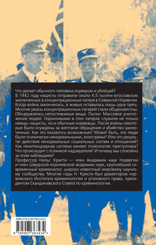 💳 Оплатить за товар можно при получении 🇰🇿 Есть бесплатная доставка по Казахстану от 1 дня 🎁 Копите бонусы с каждой покупки Серия: Человек преступный. Классика крим. психологии Что делает обычного человека изувером и убийцей? В 1942 году нацисты отправили около 4,5 тысяч югославских заключенных в концентрационные лагеря в Северной Норвегии. Когда война закончилась, в живых оставалась лишь одна треть. Многие ужасы концентрационных лагерей стали общеизвестны. Обнаружились непостижимые вещи. Пытки. Массовое уничтожение людей. Охранниками в этих лагерях служили не только немцы-нацисты, но и обычные норвежцы. После войны некоторые были осуждены за жестокое обращение и убийство заключенных. Как это оказалось возможным? Может быть, эти люди были психически ненормальными, монстрами? Или это результат действия ненормальных социальных систем и отношений? Как пенитенциарная система меняет психологию преступника? Что происходит с психикой надзирателя? И почему мы спокойно за этим наблюдаем? |