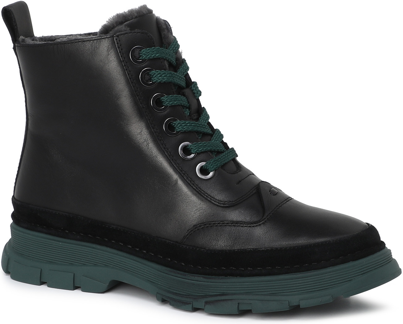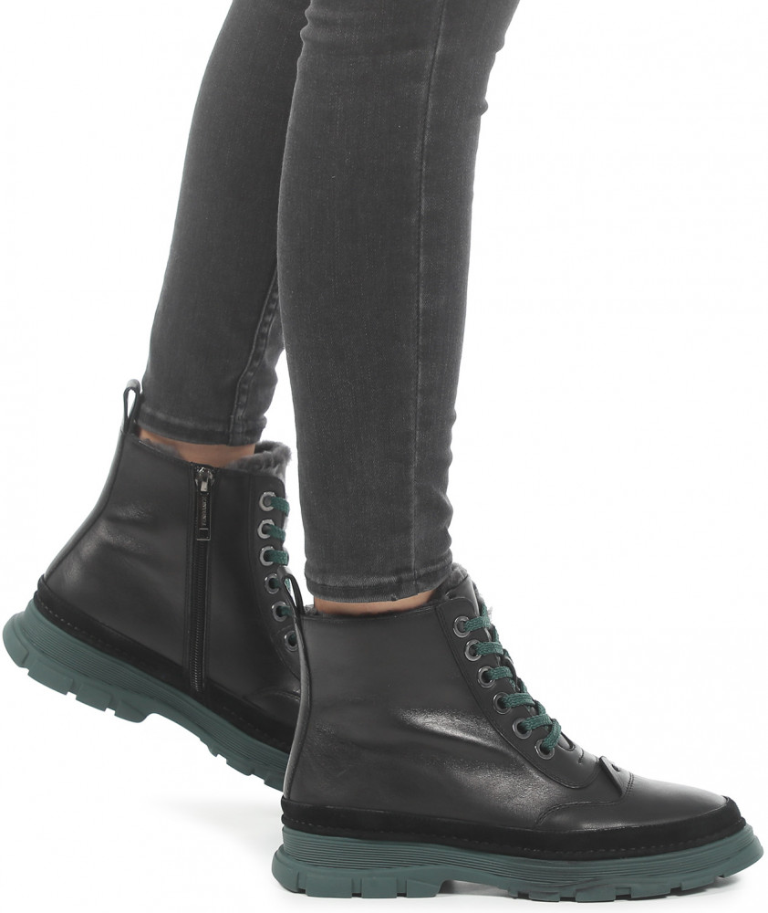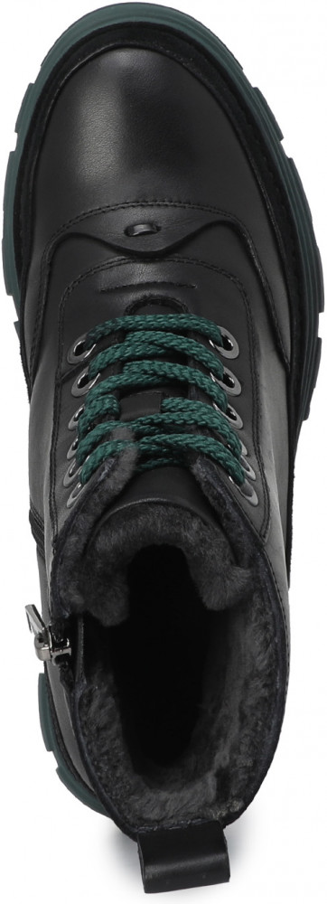 Женские ботинки из натуральной кожи теленка с гладкой обработкой материала верха. Дополнительный материал — натуральная замша. Застегиваются на молнию и шнуровку. Подошва, толщиной 2,3 см, из резины. Способ соединения подошвы — клеевой. Широкий каблук, высотой 3,3 см. Высота обуви — 12 см, объем голенища — 22 см. Стелька и подкладка из натурального меха.