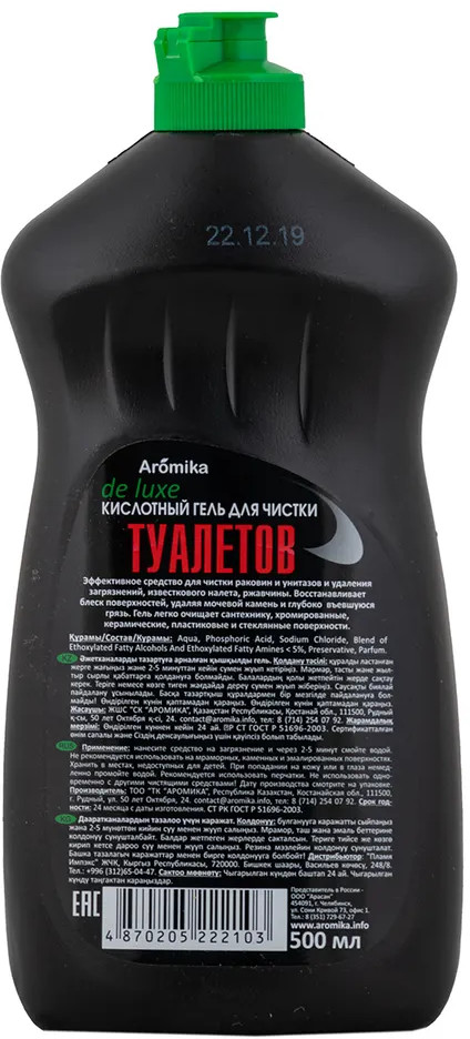 Аромика Гель для чистки туалетов кислотный «De luxe»В данный момент этот товар отсутствует в продаже. Возможно, у нас найдется аналогичный или похожий товар здесь. Эффективное средство для чистки раковин и унитазов и удаления загрязнений, известкового налета, ржавчины. Восстанавливает блеск поверхностей, удаляя мочевой камень и глубоко въевшуюся грязь. Гель легко очищает сантехнику, хромированные, керамические, пластиковые и стеклянные поверхности. |